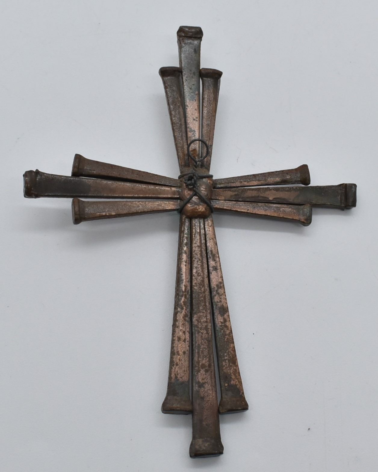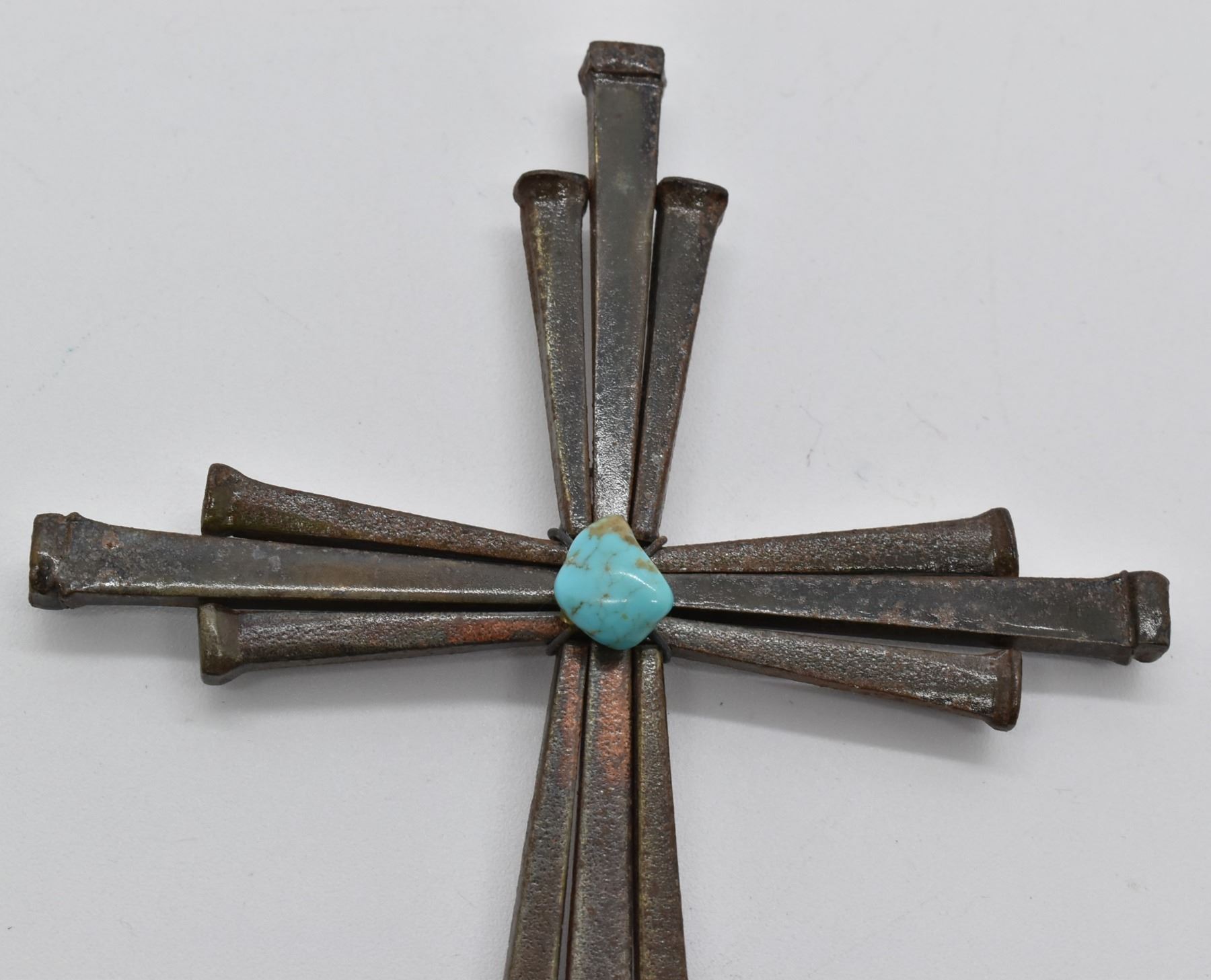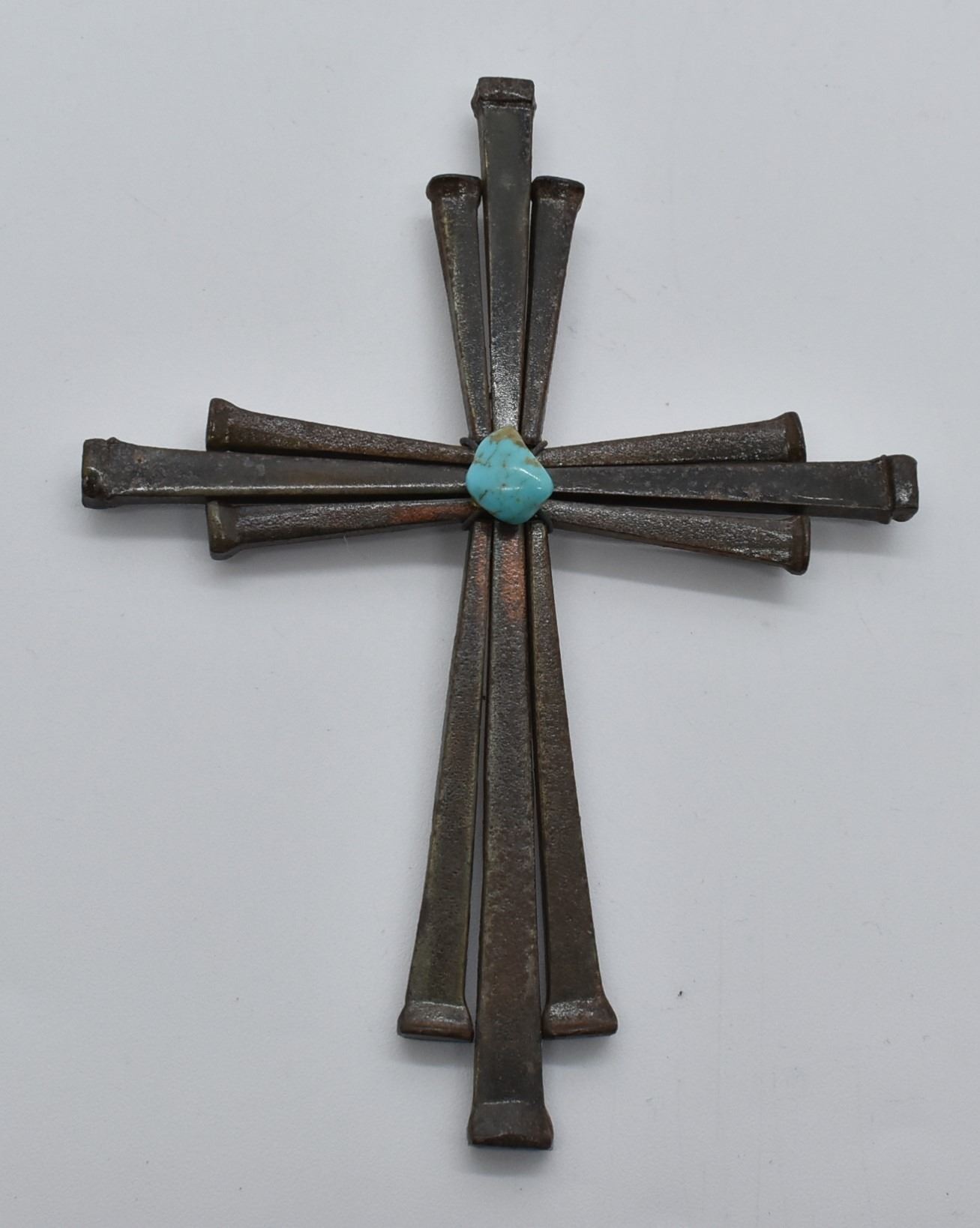 Horseshoe Nail Cross w/ Polished Turquoise Nugget, measures 5.25'' x 4'', features a polished Kingman Turquoise nugget focal