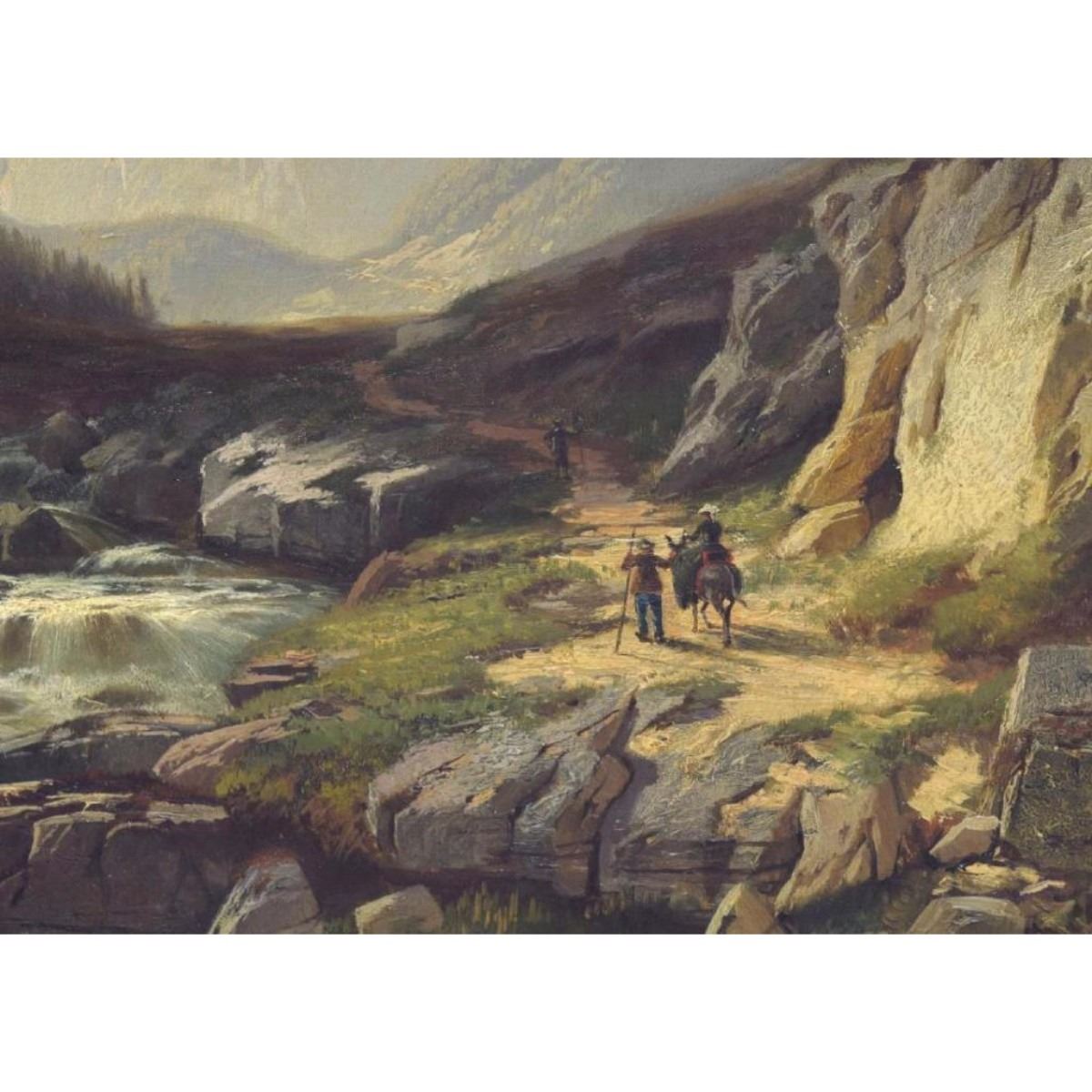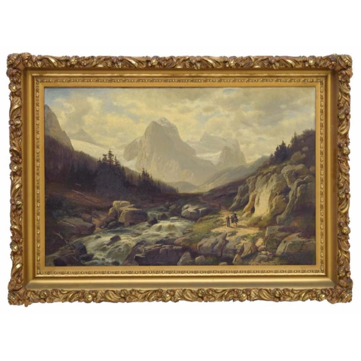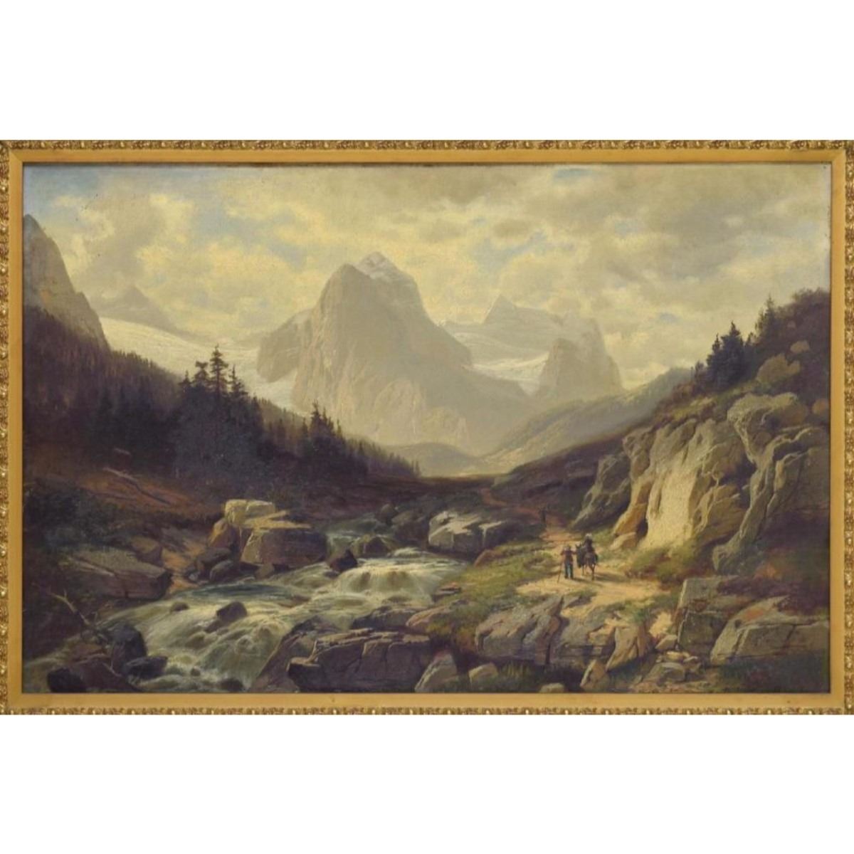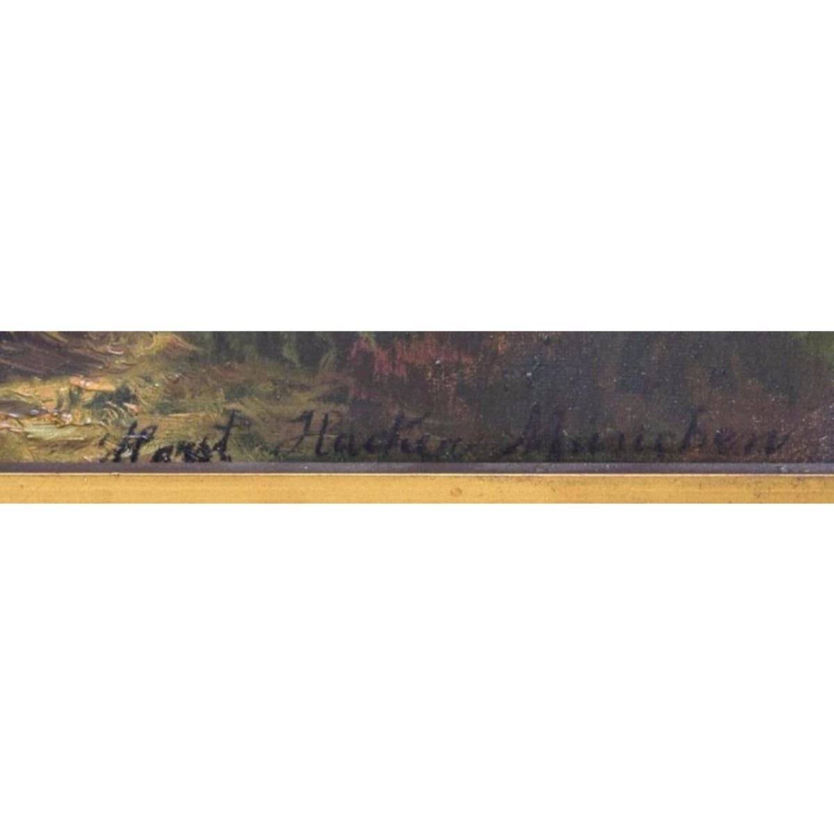 Framed oil painting, Walking Below the German Alps, signed lower right, Horst Hacker, Munich (Germany, 1842-1906), Munich gallery name stenciled on verso canvas, sight: 22.25"h, 33.25"w, overall: 30.5"h, 42"w, 20lbs