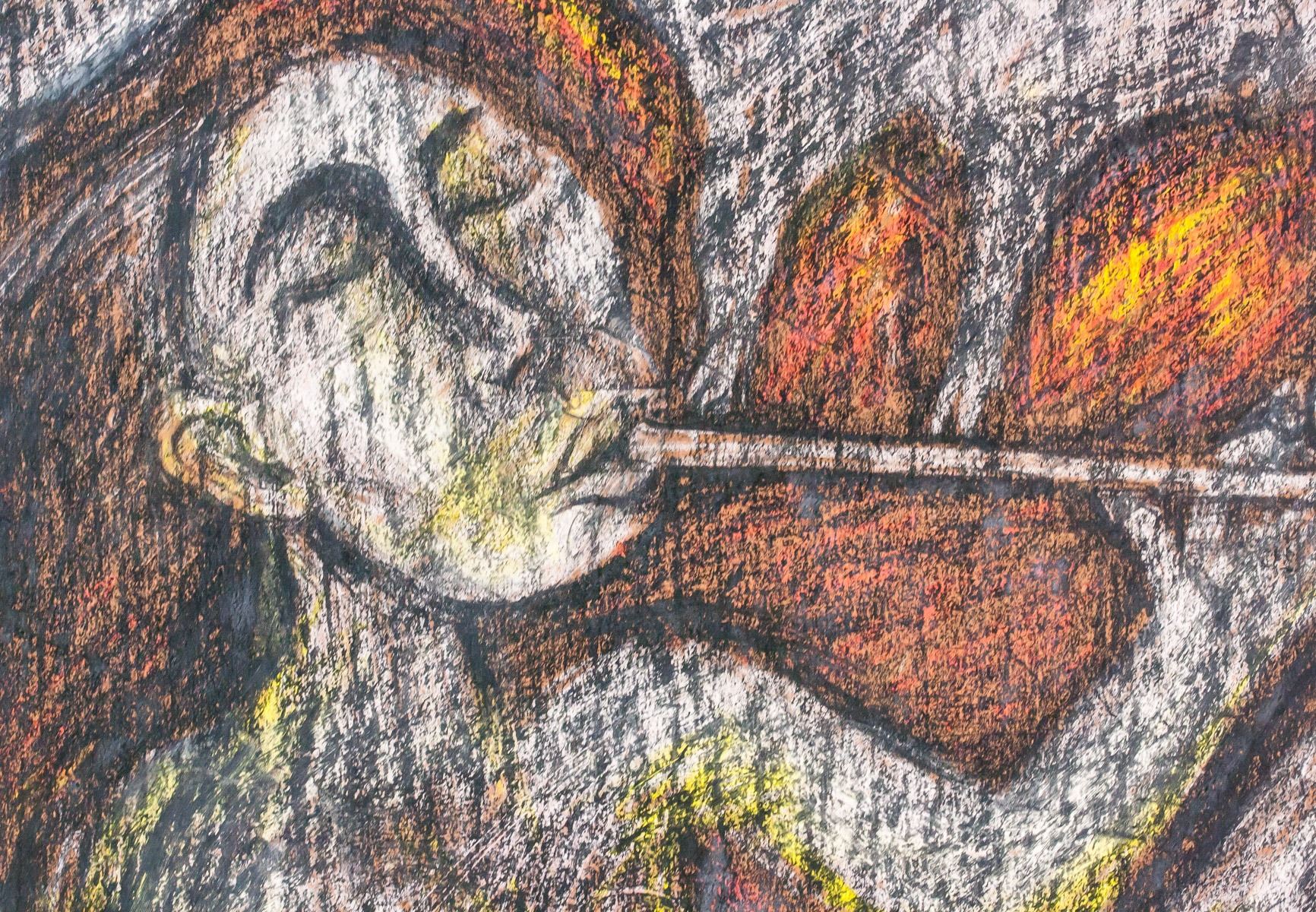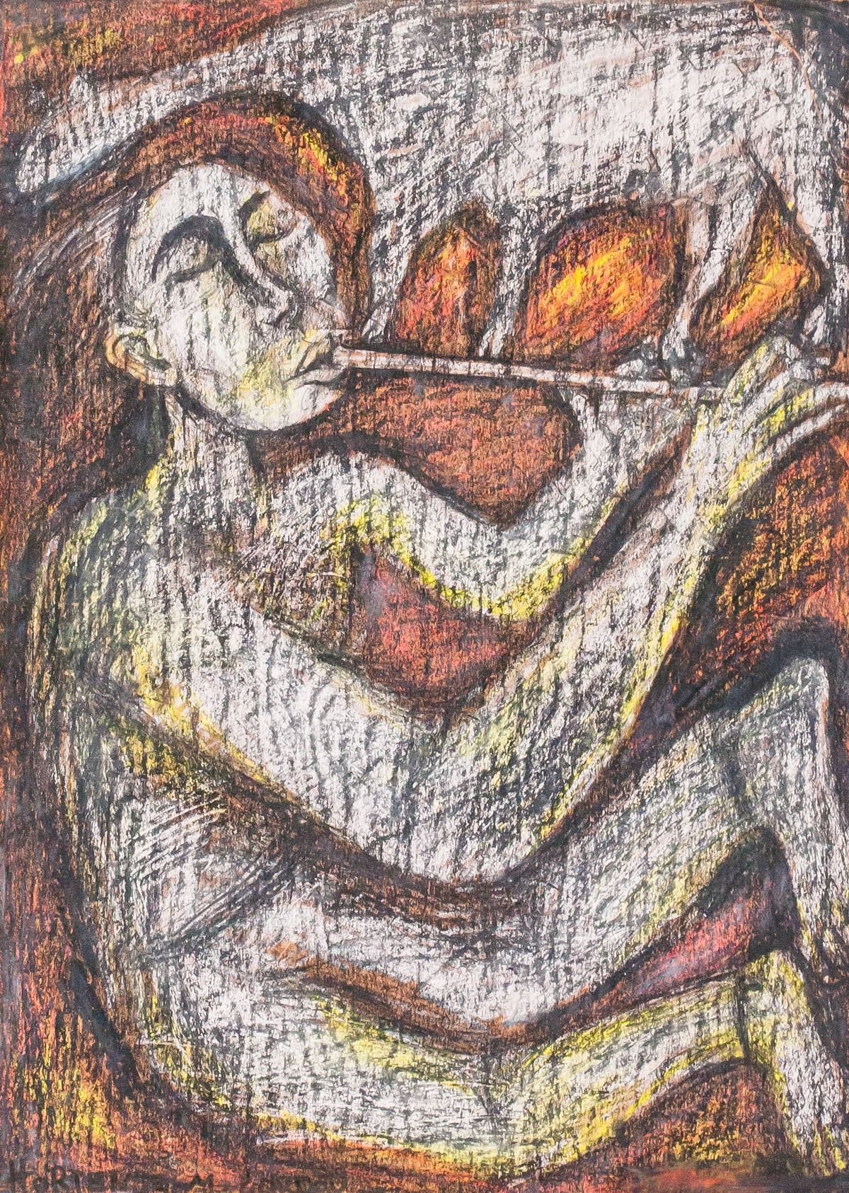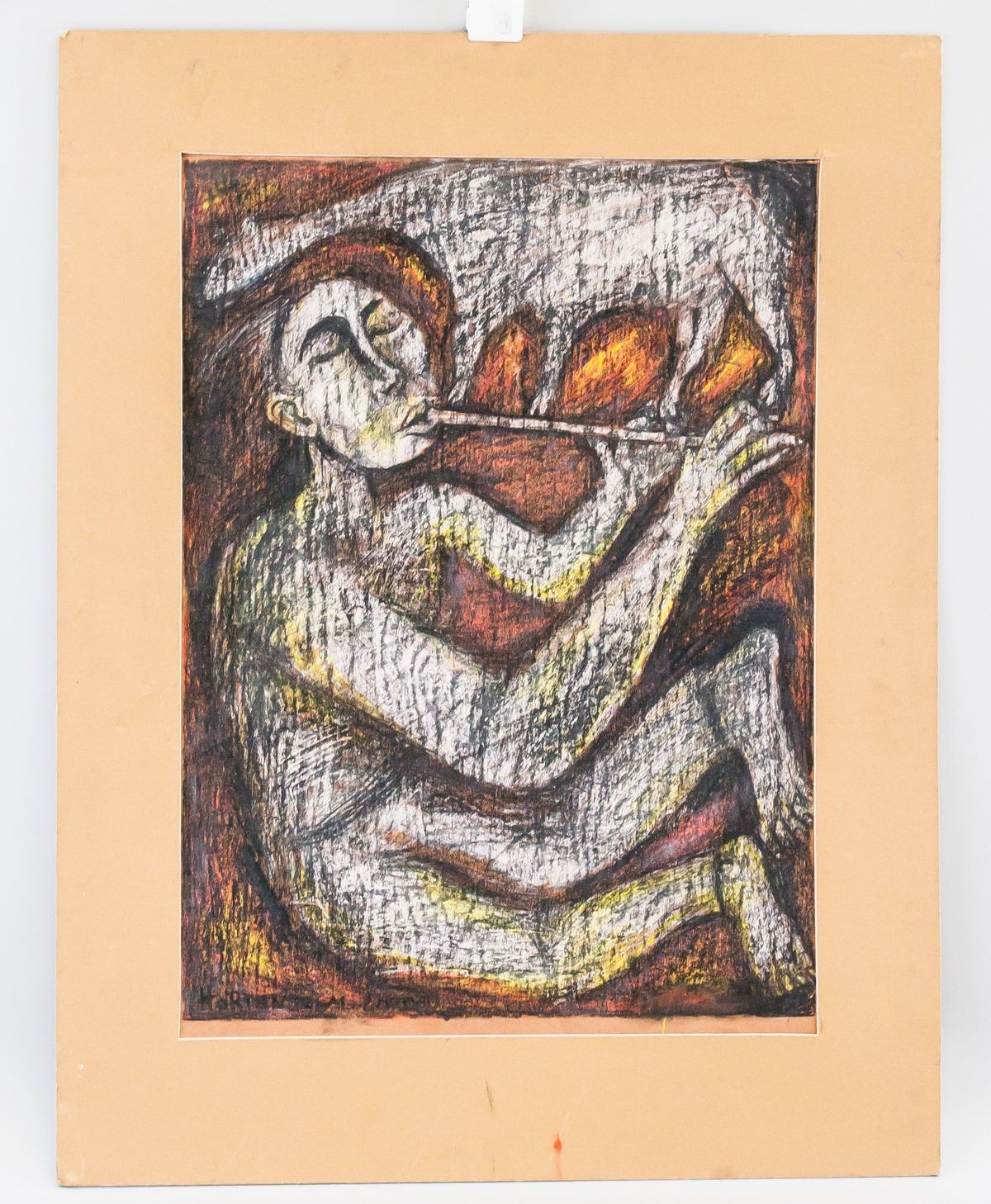 Charcoal on paper. Featuring a figure playing a flute with an animal standing on the flute. Signed "HORTENESE" in the bottom left corner. "1957" inscribed on verso. Attributed to Hortenese Mattice Gordon (1881-1961, Canadian). 76 x 59 cm (30 x 23 in). Provenance: This lot carries limited provenance from a Toronto estate