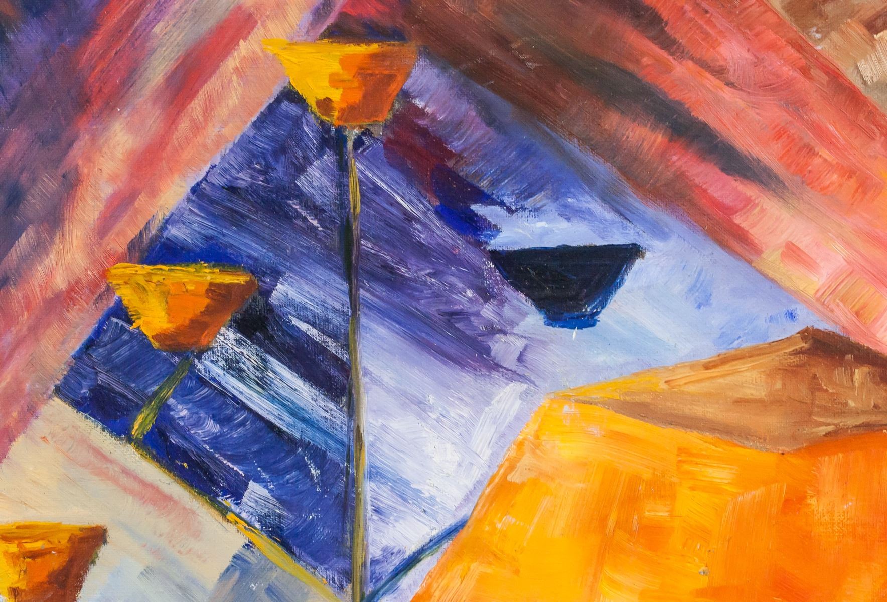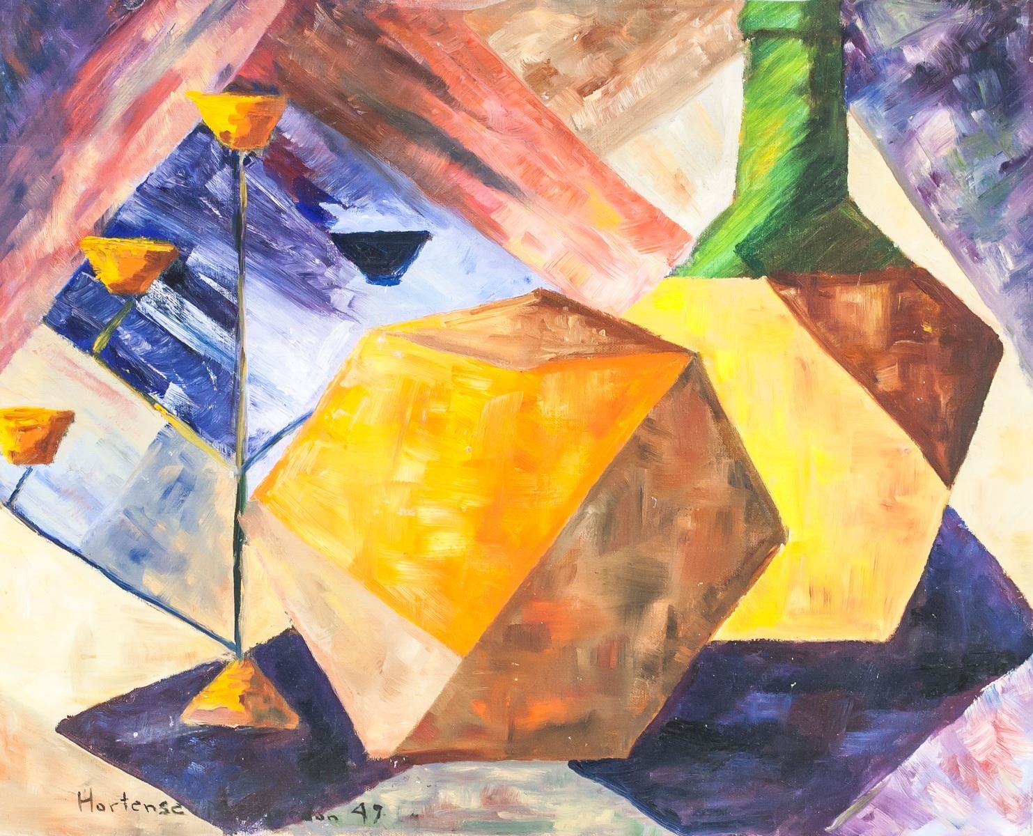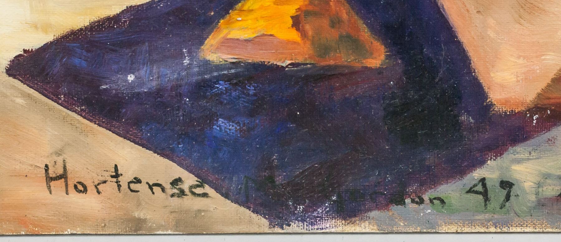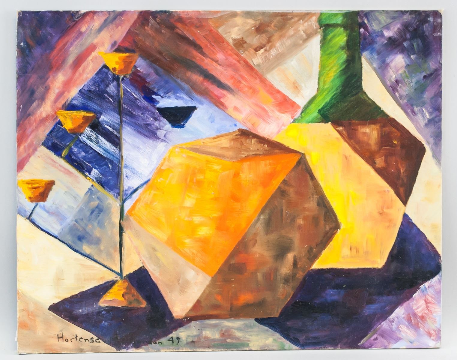 Oil on board. Featuring an abstract expressionist still life composition. Signed Hortense M. Gordon and inscribed 47 beside signature on the lower left corner. Inscribed on verso. Attributed to Hortense Mattice Gordon (1887-1961, Canadian). 41 x 50 cm (16 x 20 inches). Provenance: This lot carries limited provenance from a Southern Ontario estate