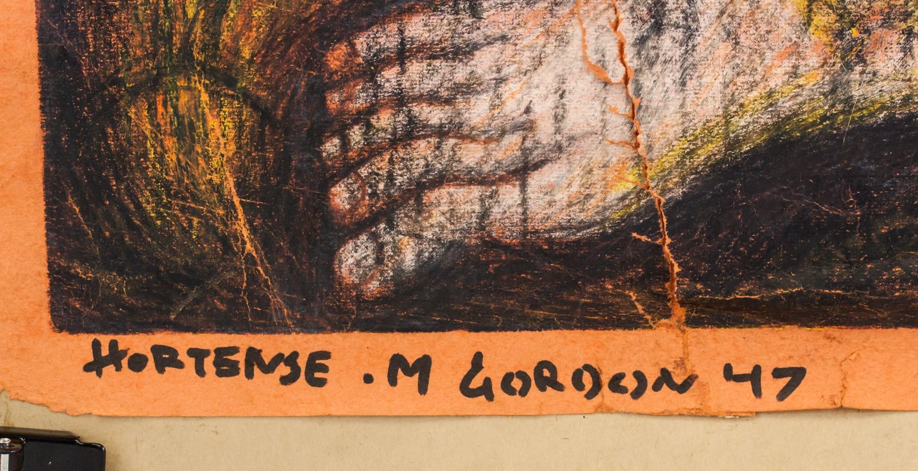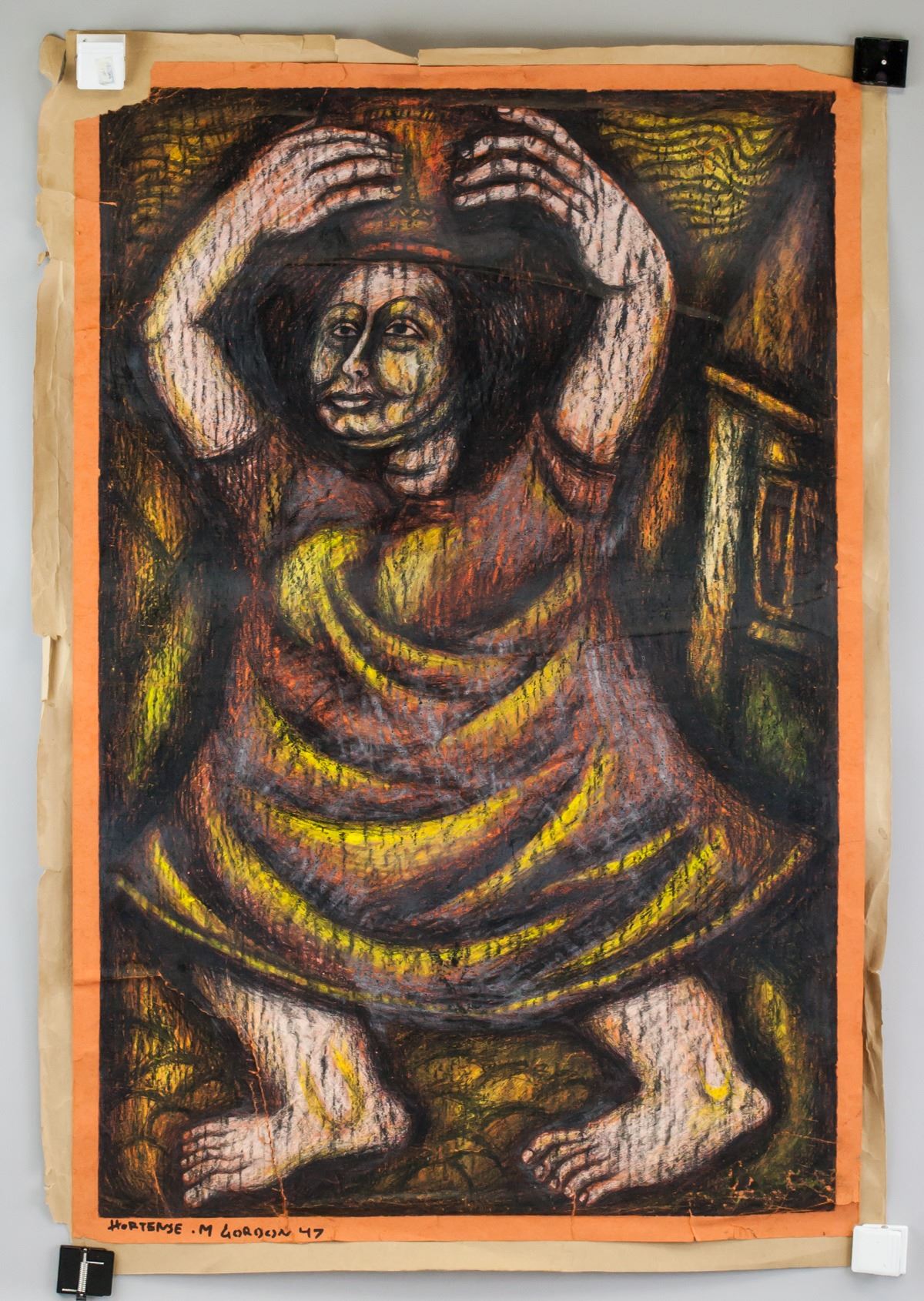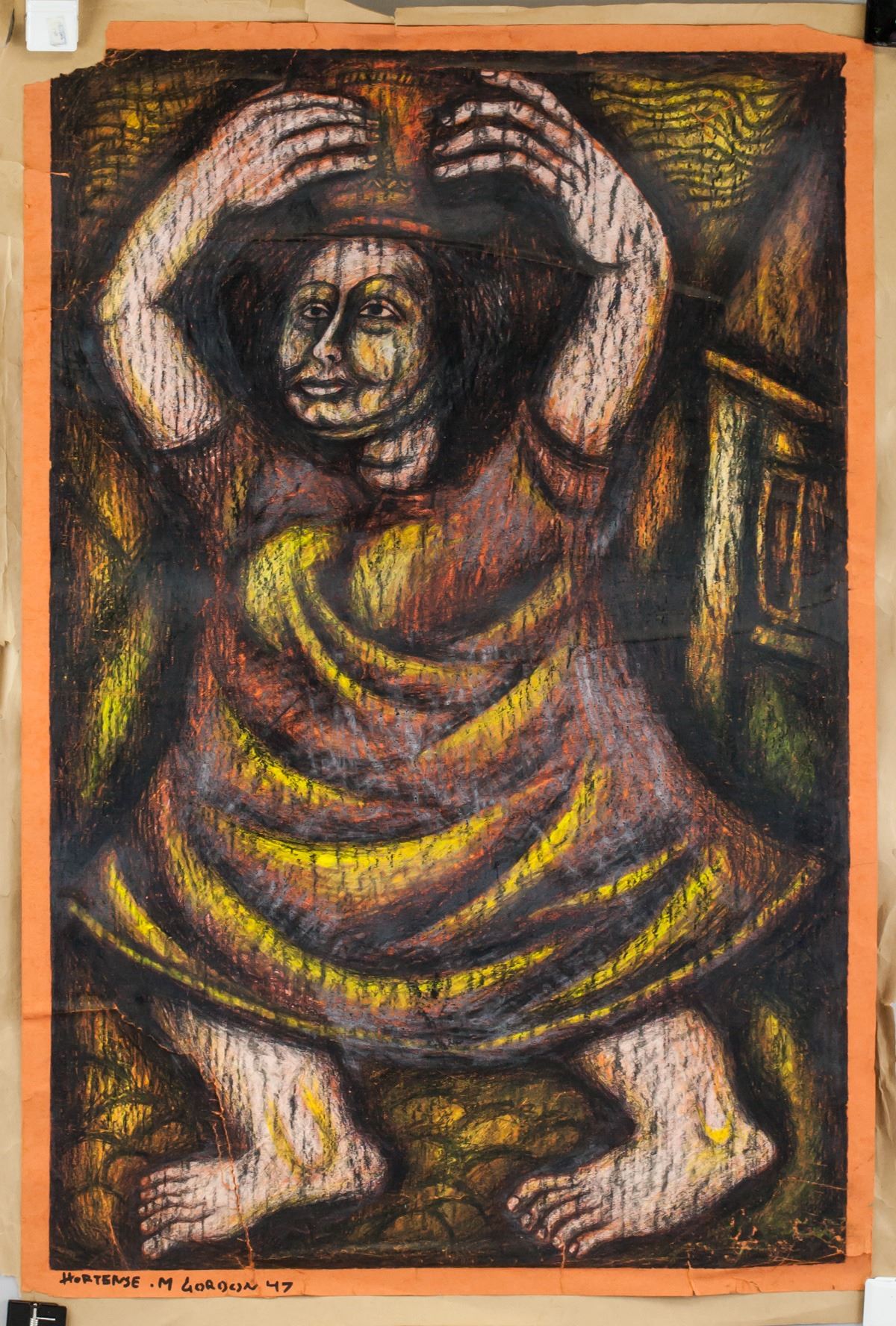 Grease pencil on paper. Featuring human figure wearing a smock and holding a jar on their head. Signed "Hortense M Gordon 47" in the bottom left corner. Attributed to Hortense Mattice Gordon (1881-1961, Canadian). Visible damage, particularly the tear on the bottom left corner. 87 x 56 cm (34 x 22 in).