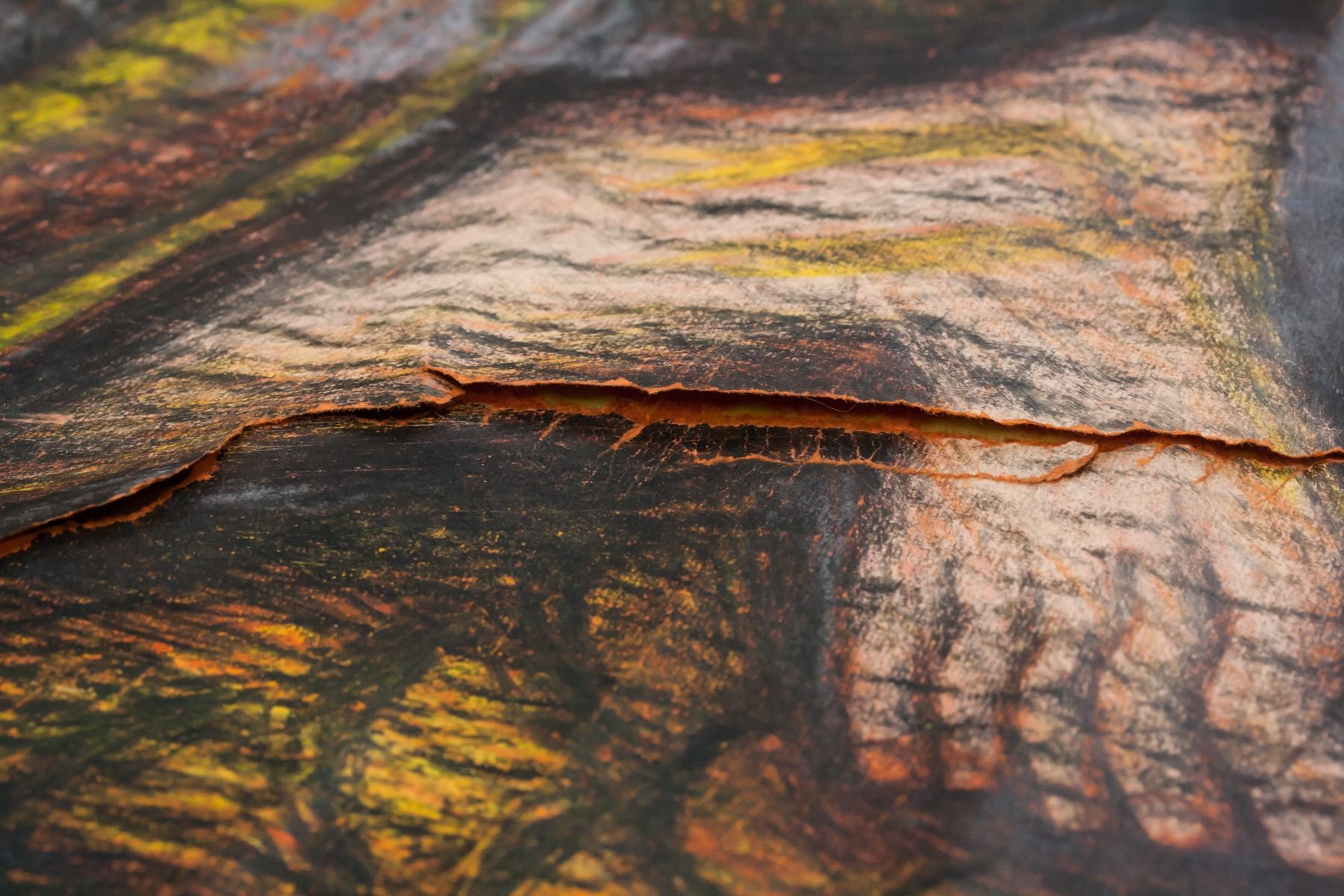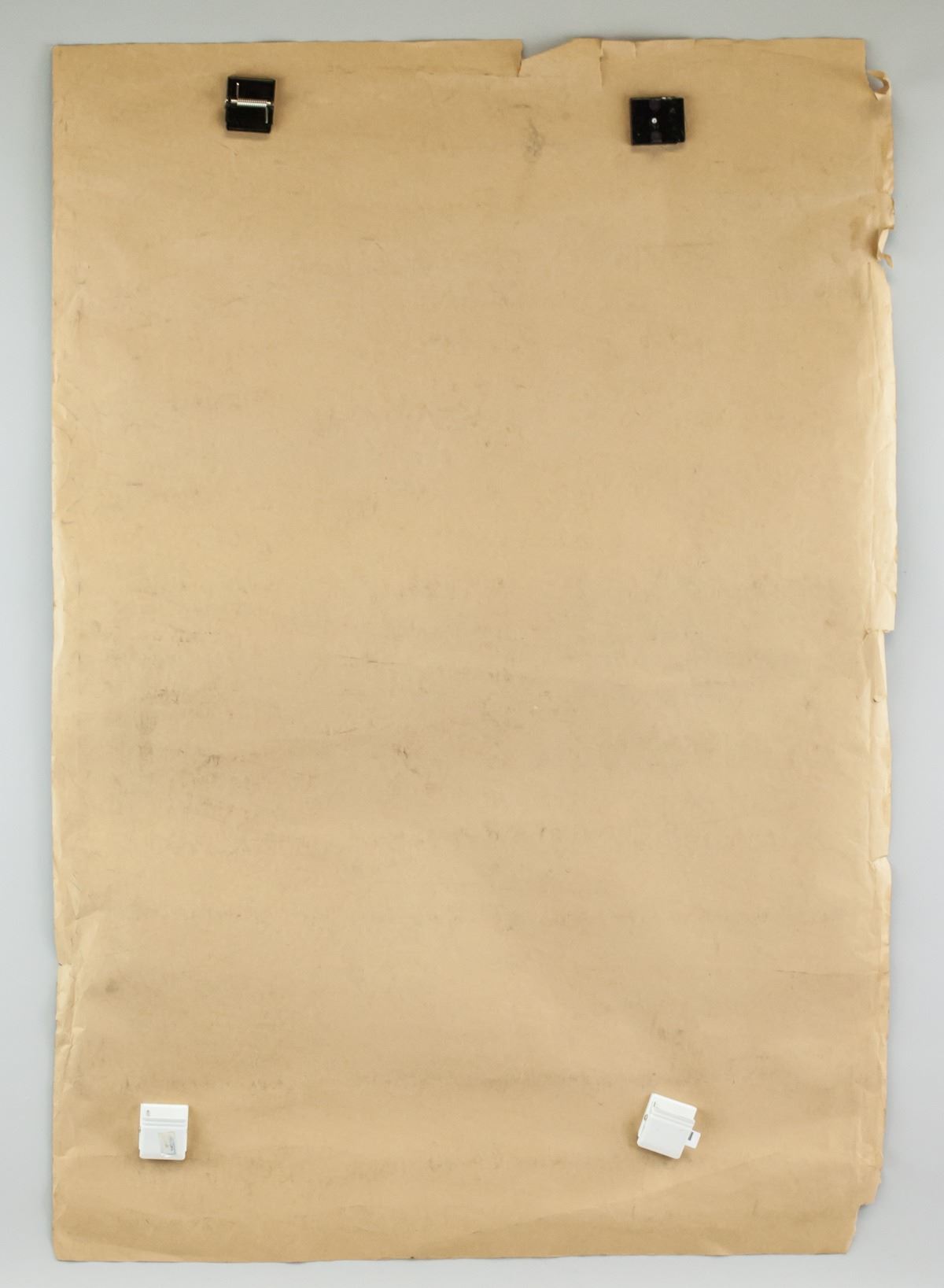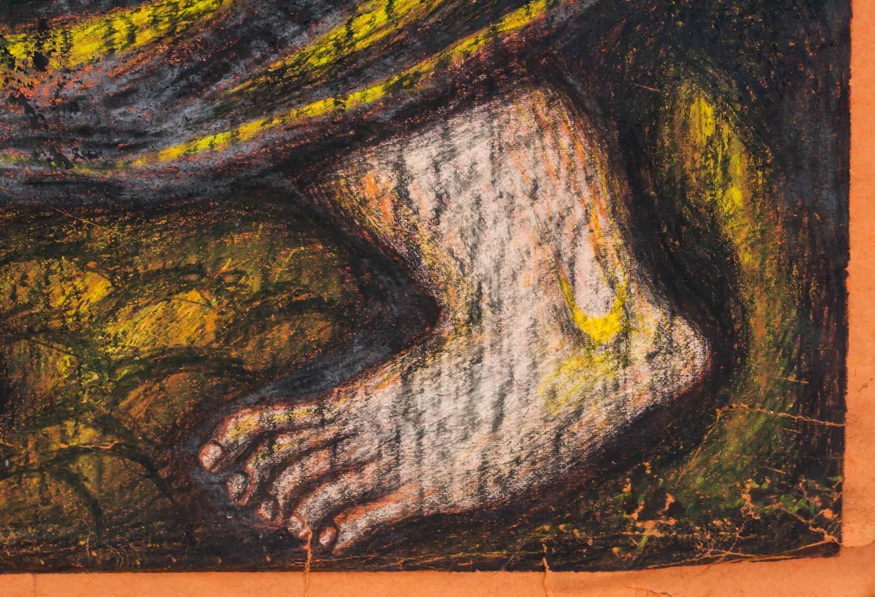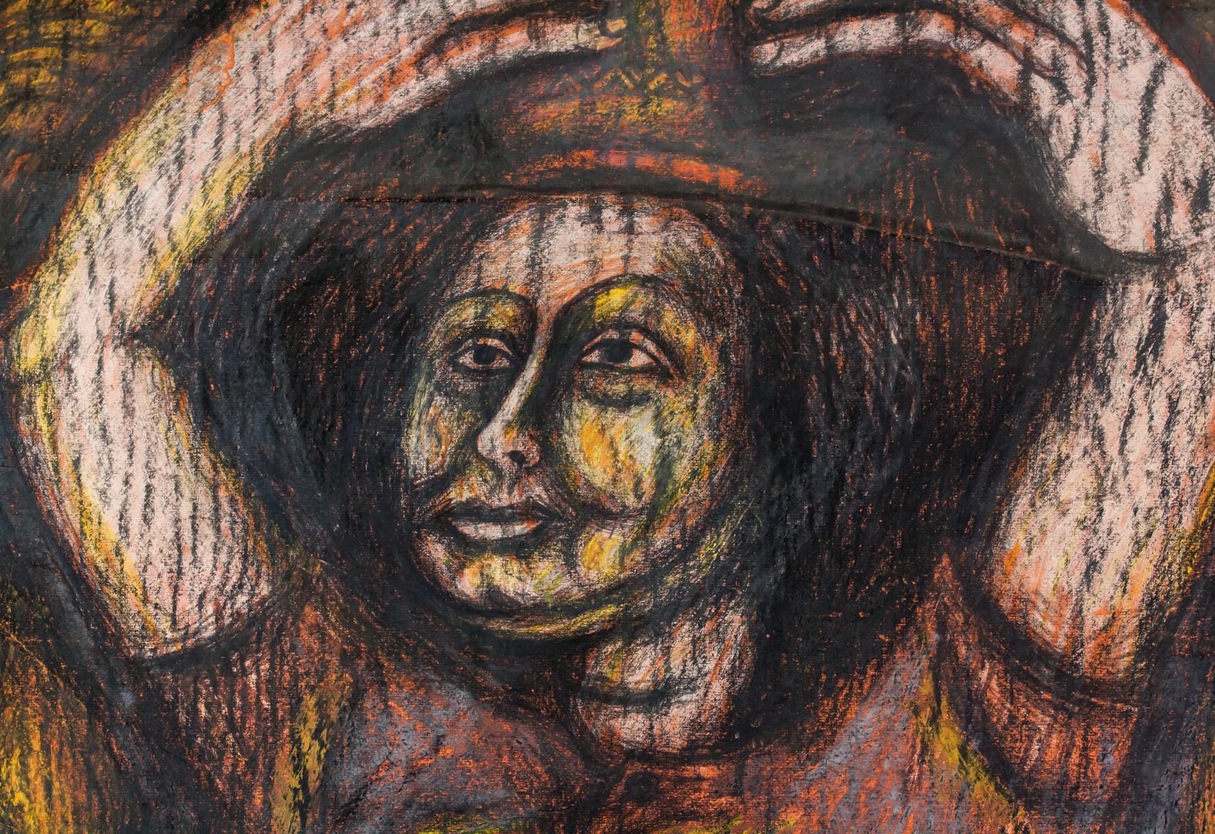 Grease pencil on paper. Featuring human figure wearing a smock and holding a jar on their head. Signed "Hortense M Gordon 47" in the bottom left corner. Attributed to Hortense Mattice Gordon (1881-1961, Canadian). Visible damage, particularly the tear on the bottom left corner. 87 x 56 cm (34 x 22 in).