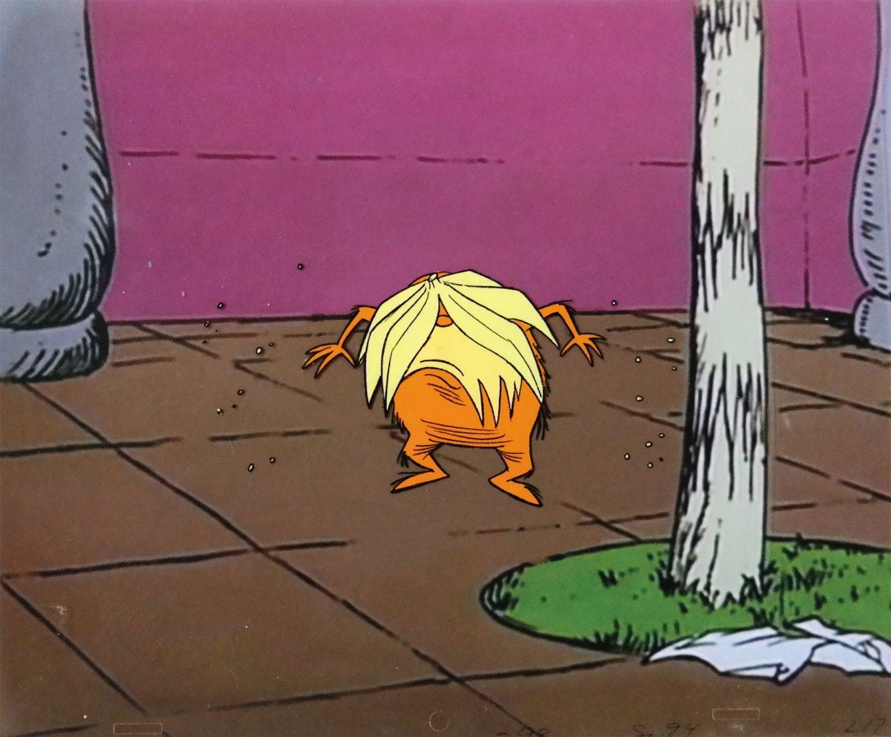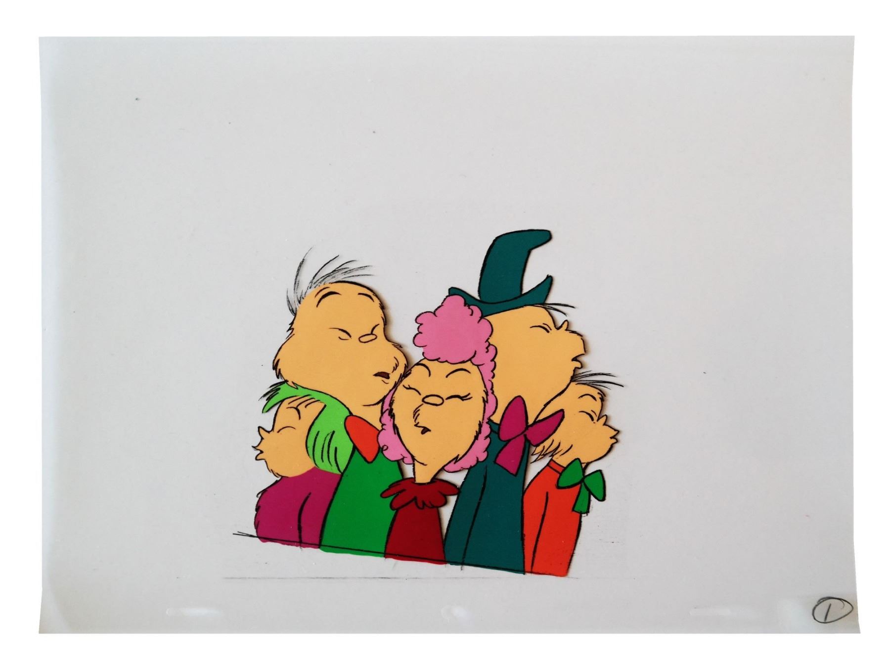 (Seuss, 1970/72) A pair of original animation cels from the classic Dr. Seuss animated shorts "Horton Hears a Who!" and "The Lorax". The cel from "Horton Hears a Who!" depicts five citizens of Whoville and appears in the short just after Horton says his iconic line, "A person is a person no matter how small". This citizens in this cel are shouting "We're here!", and have an image size of 6"x5.5" on their 10.5"x12.5" animation cel. The cel from "The Lorax" features the title character after the Once-ler drops a banana peel on his head. The character has an images size of 3.25"x4" on its 10.5"x12.5" cel sheet. The Lorax cel comes with a recreated printed background for display.