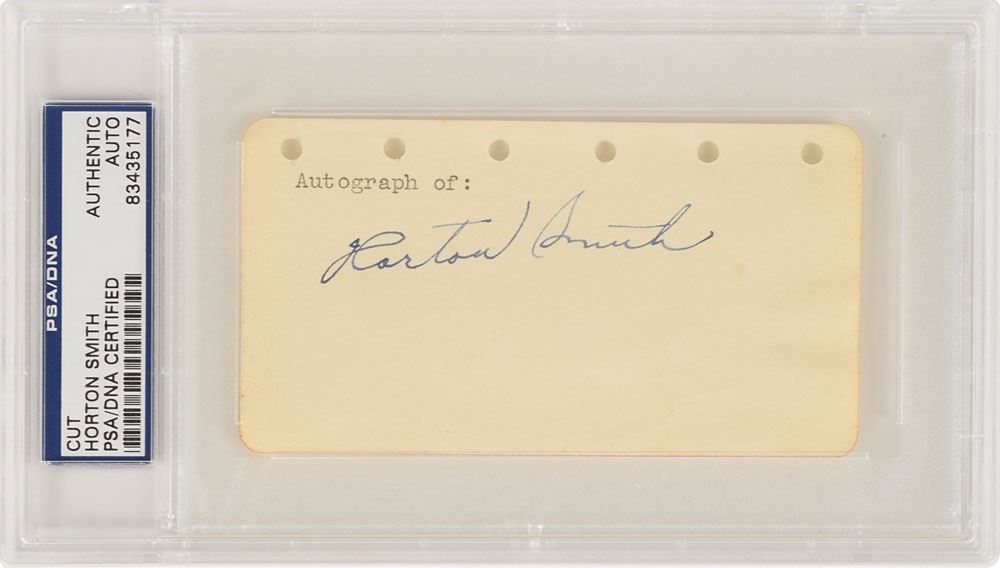 Early 'boy wonder' of golf (1908–1963) who, at the age of twenty-one, played on the 1929 PGA tour and won eight of twenty-two events. He also won the first Masters Tournament, hosted in 1934. Vintage fountain pen signature, "Horton Smith,” on an off-white 4.5 x 2.5 album page. Encapsulated in a plastic PSA/DNA authentication holder. In fine condition.