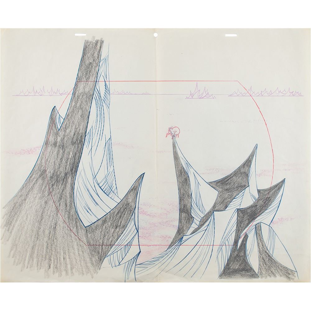 (MGM Studios, 1954) Original production drawing of Horton and mountain ranges from Horton Hears a Who!, which shows the elephant perched atop a point jagged mountaintop during his pursuit of the vulture Vlad Vladikoff, who has flown away with his Whoville clover. Accomplished in graphite and colored pencil on untrimmed 16.5 x 13.5 animation paper. Images measure .75 x .75 (Horton), 16 x 12.75 (foreground mountains), and 15.25 x 1 (background mountains). In fine condition, with a central vertical fold and trivial creases.