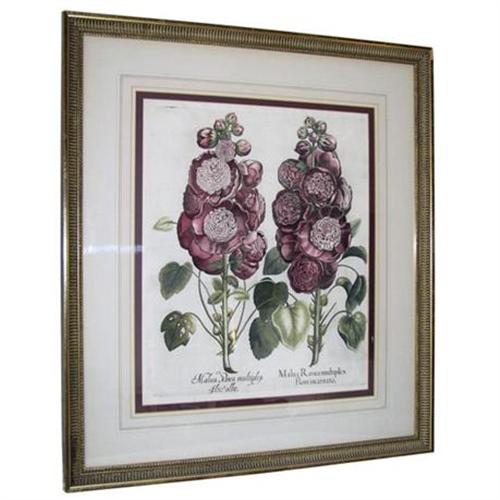 Hortus Eystettensis (The Garden of Eichstätt), published by Basilius Besler (1561-1629) in Nuremburg in 1613 (1st edition), depicting the species Malua Rosea. Printed on heavy laid paper with printed description on verso, and species titles on front in Latin. These items come from the collection of Roni Steinberg Sokoloff and resided in her former 63-acre estate in Bedford New York known as Cantitoe Farms. (The estate is down the road from Martha Stewart's home by the same name.) Ms. Sokoloff purchased the engravings from a Manhattan dealer in the early 1980s, and they were framed by J. Pocker & Son, one of the leading framing companies in New York since 1926. Frames measure 25.5" by 29.25" by 1". Prints measure 16" by 20". We have not removed the prints from their frames for inspection. These framed prints are being sold "as is" and we will not dismantle the frames for shipment. This is one of two engravings that remain from Ms. Sokoloff's collection of four engravings. The collection of four were appraised in 1988 by Anton Rudert Jr Appraisals (30 East 42nd Street, New York NY) for $5,000, and we will gladly provide a copy to the buyer.