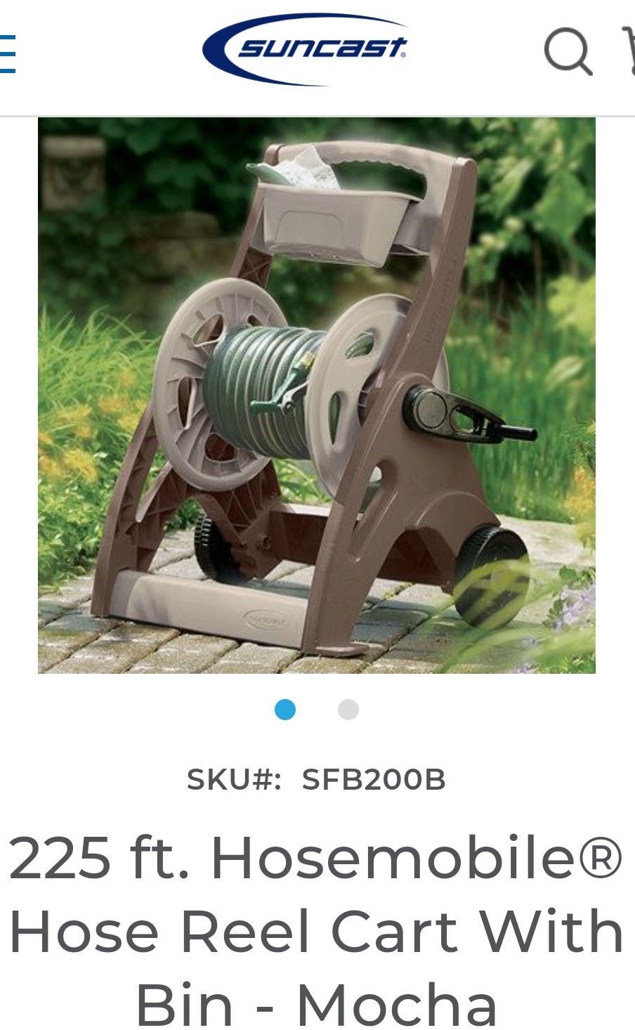 Mobile hose reel cart with storage bin, accommodates 225 ft. hose, sturdy resin construction, new.
