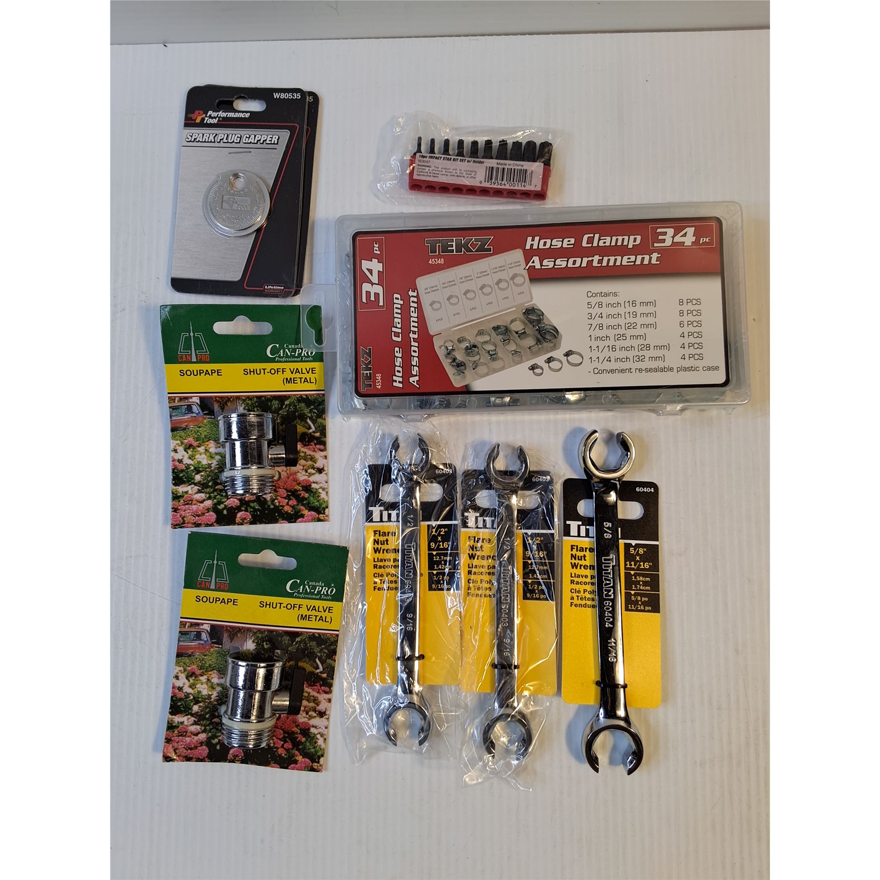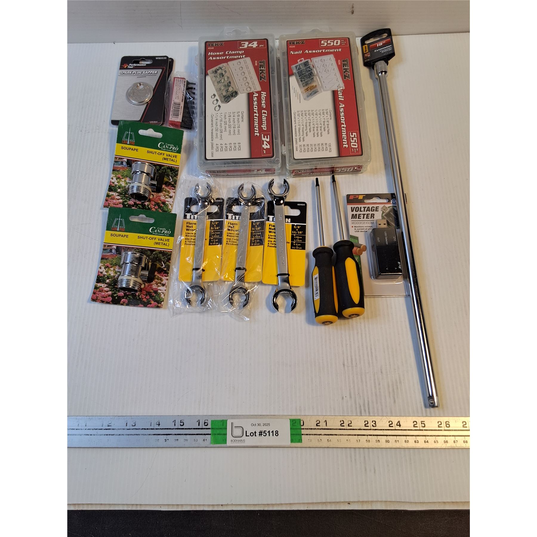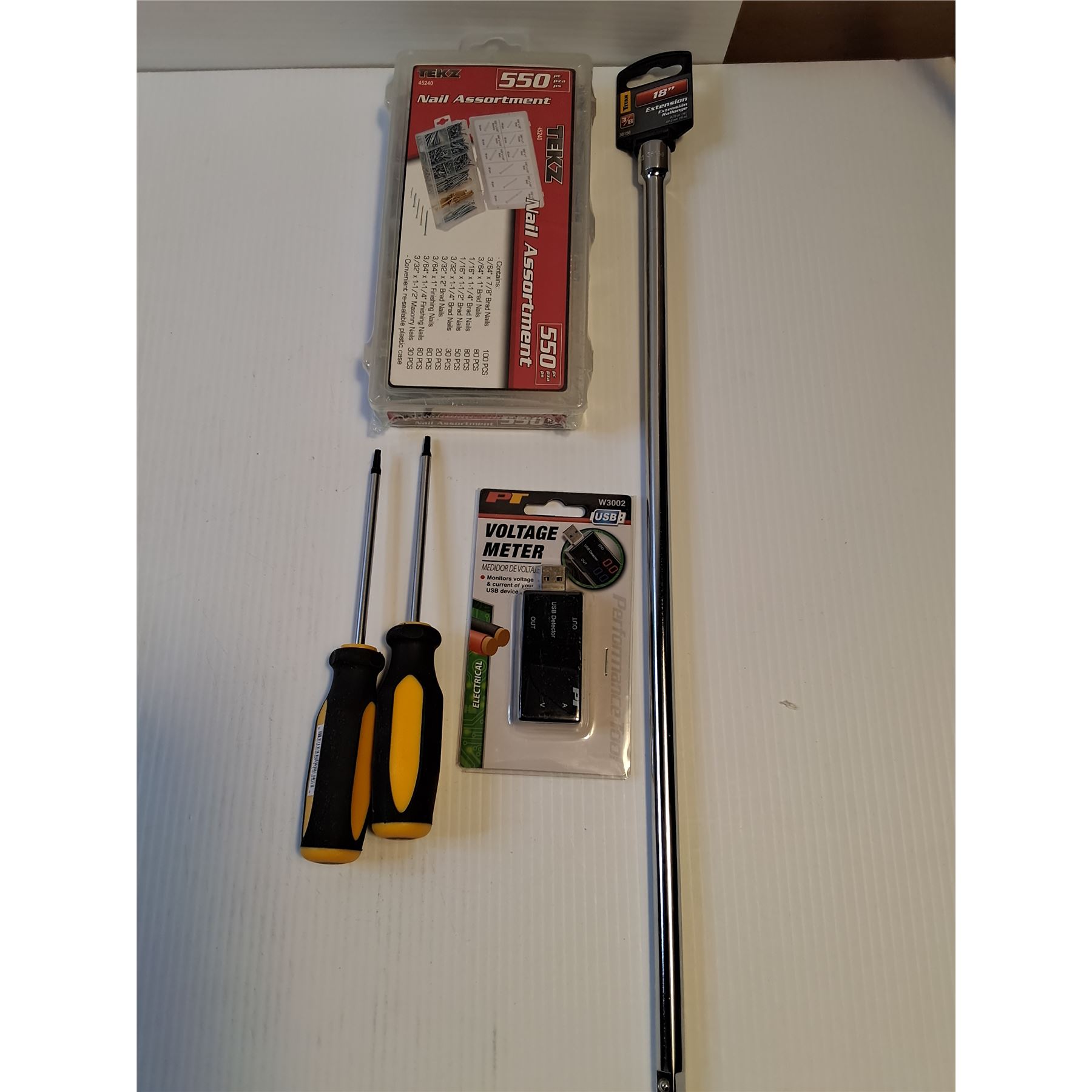 Hose Clamp Assortment,Nail Assortment,18" Extension,(3) Wrenches,(2) Scrwdrivers and more as picture