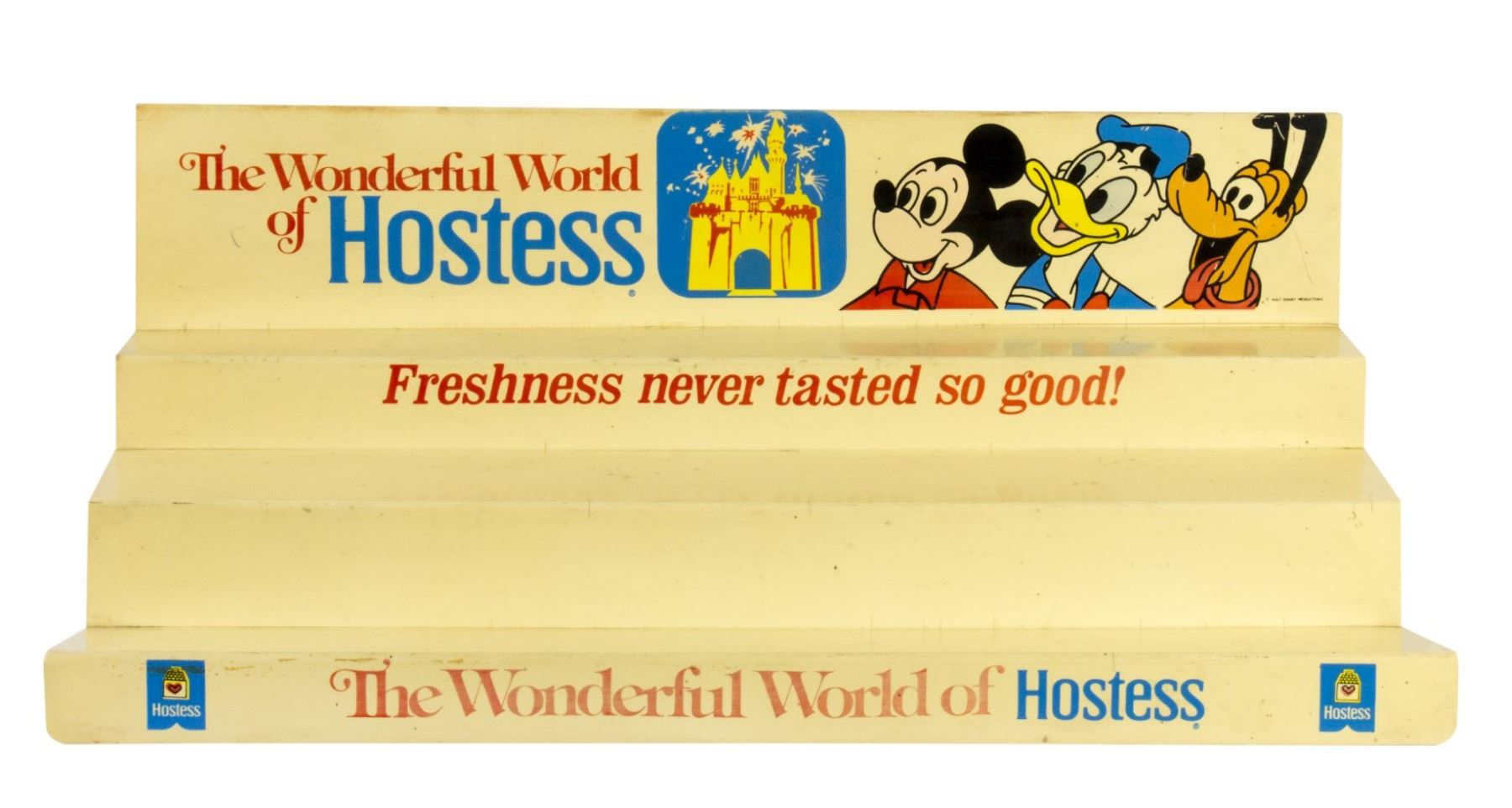 (Disneyland, 1970s) An early store display by Hostess that was used to promote Disneyland. The display features Mickey, Donald, and Pluto and reads "The Wonderful World of Hostess" next to imagery of Sleeping Beauty Castle. The display measures 13.5"x24" and 7.5" tall. The condition is good with some wear throughout, including a crack along the top-right edge.