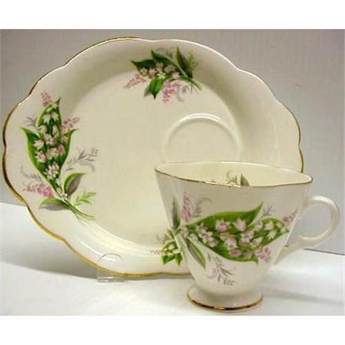 Elegant and pretty hostess set - Made by Windsor , bone china in England - Decorated with gorgeous Lily of the Valley - Excellent condition - Saucer or tray measures about 8" x 6" and cup is regular size - Please include 7.00 for shipping + insce. - Thanks!