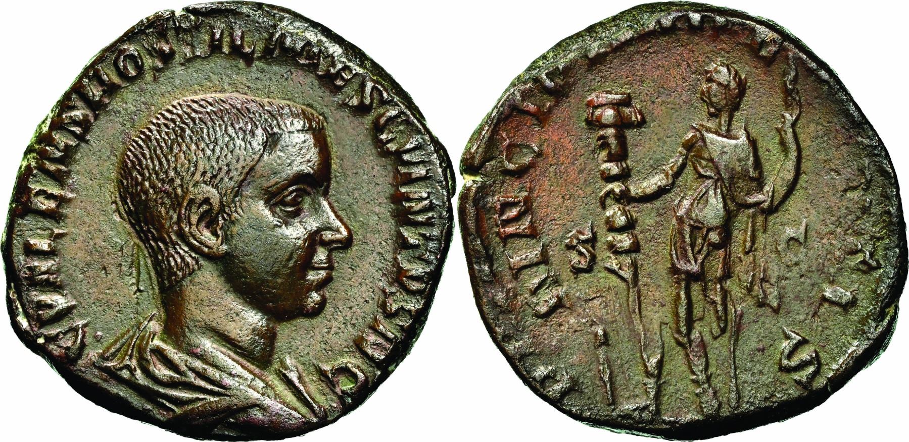 Hostilianus, Sesterce, Rome, AE 17.18 g. Avers : C VALENS HOSTIL MES QVINTVS N C Buste drapé à dro