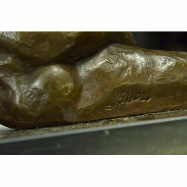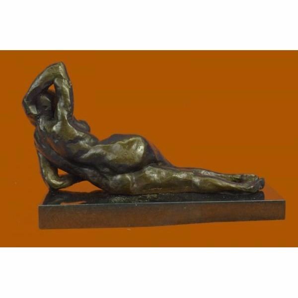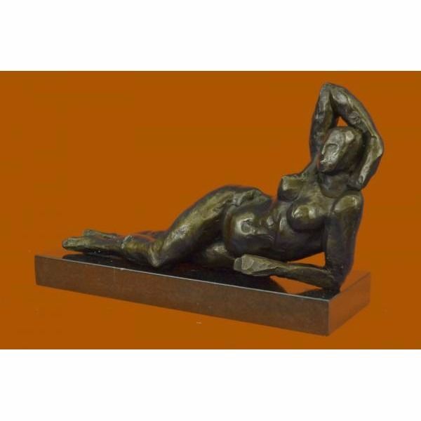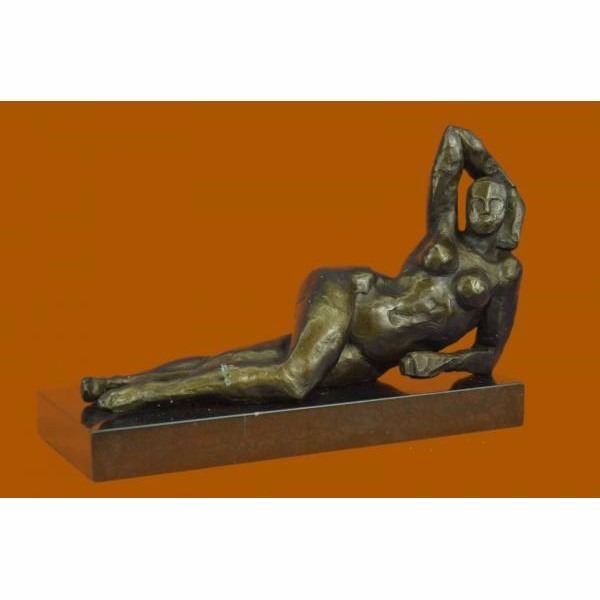 Tribute to the artist Henry Moore abstract and representational style, the woman is proportionally exaggerated, giving a defined plumpness to every part of her form. The pleasantly full-figured lady lays on ground both calm and relaxed. Her head tilts dexterously upwards as she casts her eyes to the blue skies of a beautiful summer day. A sense of peace and happiness runs across her smile. Her left arms hangs downward onto her lap. Her right arm rest on the ground as if she were posing for the beholder. She was created using the lost-wax method of casting. This technique allows the molten precious metal to mold to the smallest detail of the artists cast. Fantastic detail is seen in the folds of skin on her stomach, neck and mouth. The 100% bronze sculpture with a brown patina finish is mounted upon a black marble and is numbered. Condition : This sculpture is in perfect condition. Bronze Dimensions with Marble Base:Height 8.5" x Width 13" Marble Dimensions: 12" X 4.5" Height without base: 7.5" Weight : 13 LBS Inventory : 62XNAB1336726