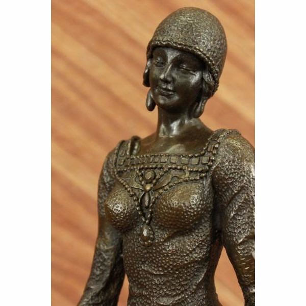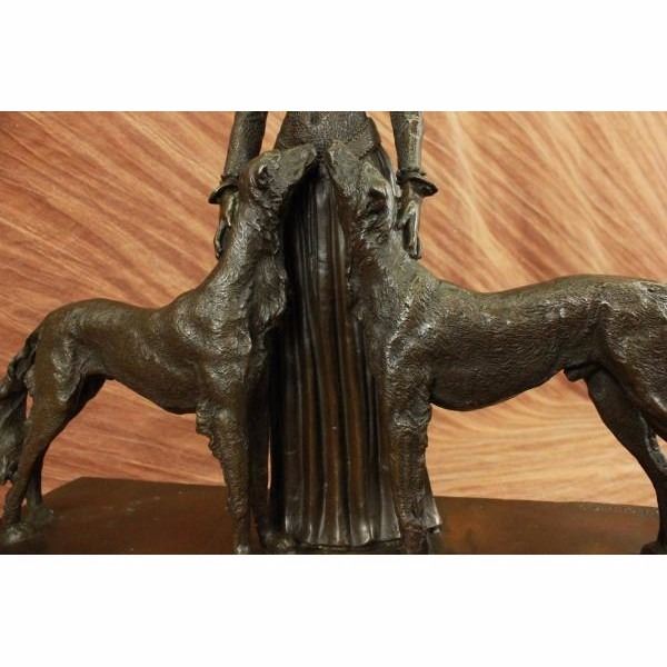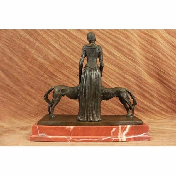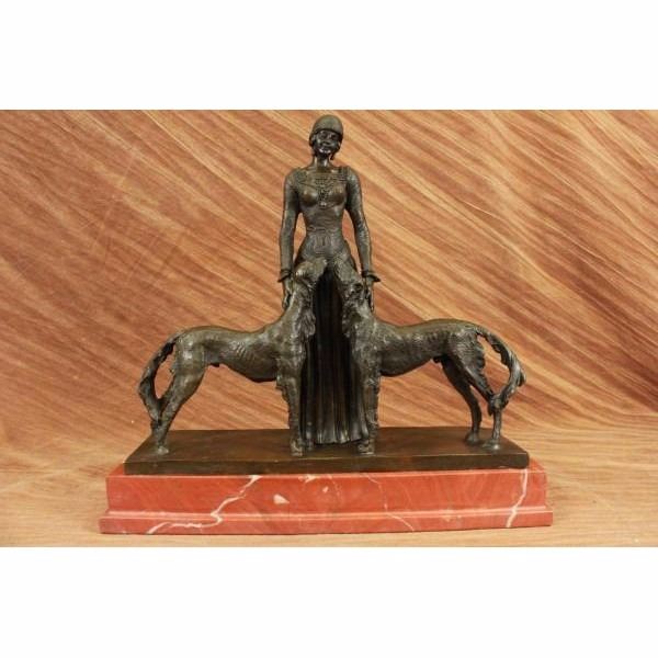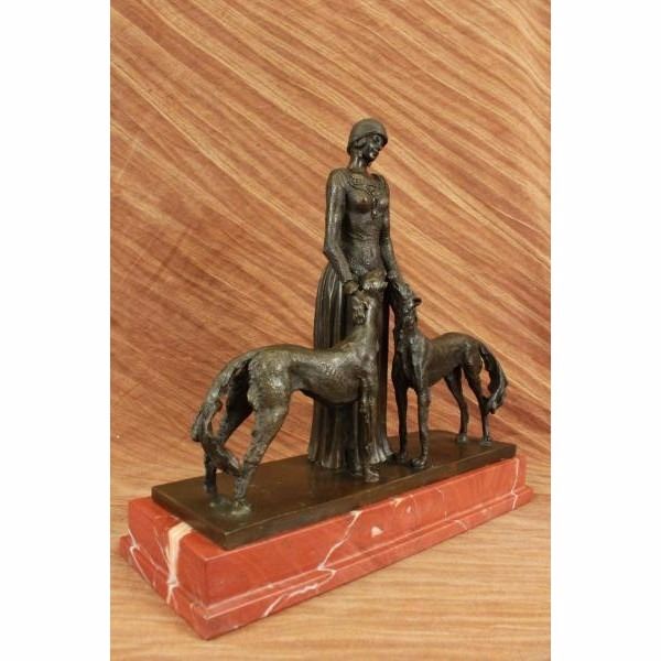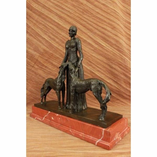 The two Afghan hunting hounds come up together, in perfect symmetry, to greet their beautiful owner that has stepped outdoors to gather in the twilight of the night. The beads and sequences of her exquisitely detailed dress, mirrors and shoots off little lights, in hues of the setting sun. She looks down at both adoring eyes and lets go of her heavy musings to give them a gentle and compassionate pat on the heads. The handmade bronze sculpture was molded using the age-old method of lost-wax casting and stained with a brown patina finish for perpetuation. She is mounted upon a variegated red Tennessee marble base with the European Bronze Finery stamp of quality and the artist D.H. Chiparus's signature. Condition : This sculpture is in perfect condition. Bronze Dimensions with Marble Base:Height 16" x Width 17 1/2" Marble Dimensions:17 1/2" X 6 1/2" Height without base: 14 1/2" Weight : 30 LBS Inventory 65-X200911256