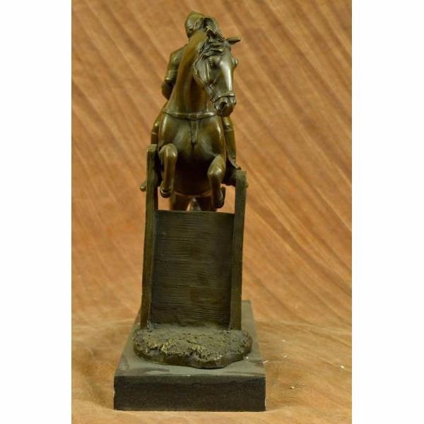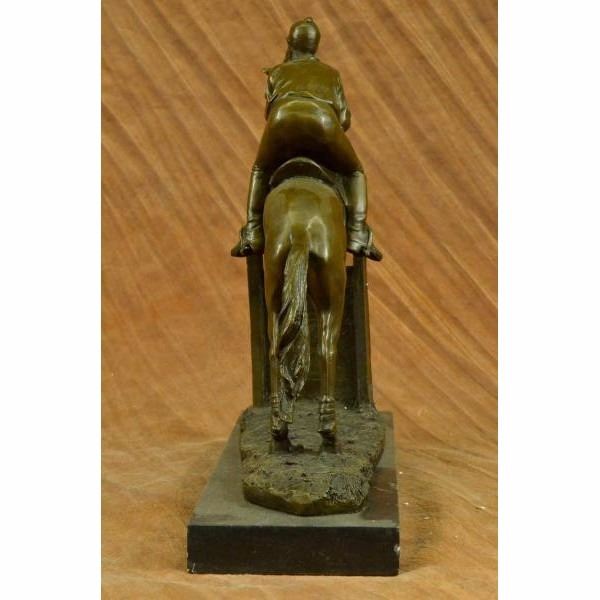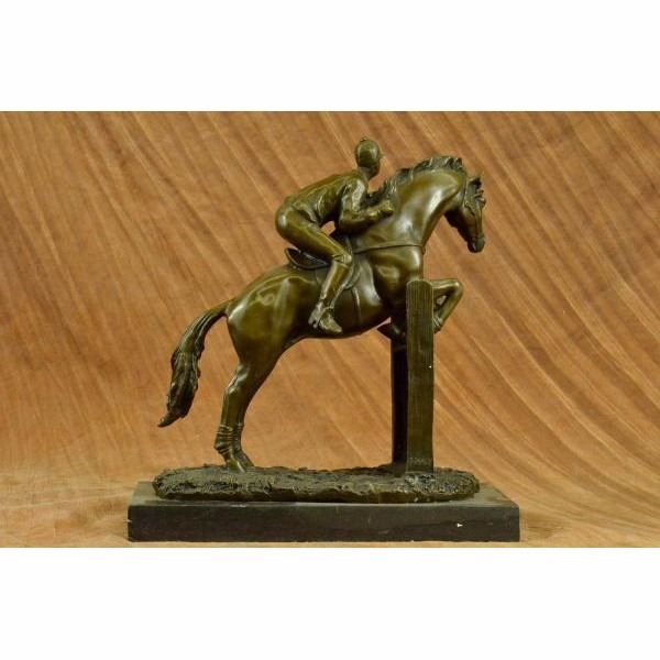 This thoroughbred and jockey are on a mission to win first place. In full stride this horse gallops his way to a fast finish. Running on a grass track this horse refuses to lose this derby. He exerts full speed as he pushes against the wind, his tail flys back with force, as the jockey encourages his partner to go full speed ahead. The jockey and the Horse both wear a look of determination as they stare down the finish line. The Horse lets out a neigh while pushing himself to the limit. Beautifully detailed his muscles are hard as he runs, his chest bulges with energy. The grass seems to be untouched with hoof prints assuming our horse has the lead. The jockey stays concentrated as he kicks his heels inward, keeping his feet in the stirrups. This is a great action piece and deserves to be displayed up front and center on a glory wall. This is a great gift to give for an avid horse lover it is also suitable for the person with drive in their life. The 100% handmade bronze sculpture was molded using the age old method of lost wax casting and stained with a brown patina and it is mounted upon a black marble base. Bronze Dimensions with Marble Base: Height 13 X Width 12 inches. Weight: 12 LBS. Please Note: This is a reproduced bronze sculpture from the original molded and signed. This featured bronze sculpture is a recast after the original, and has been done recently. This 100% bronze sculpture is an abstract piece certain to be a conversation piece.