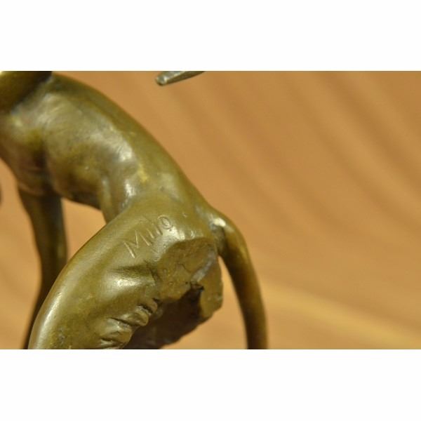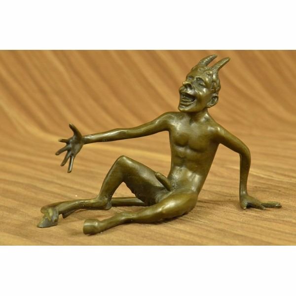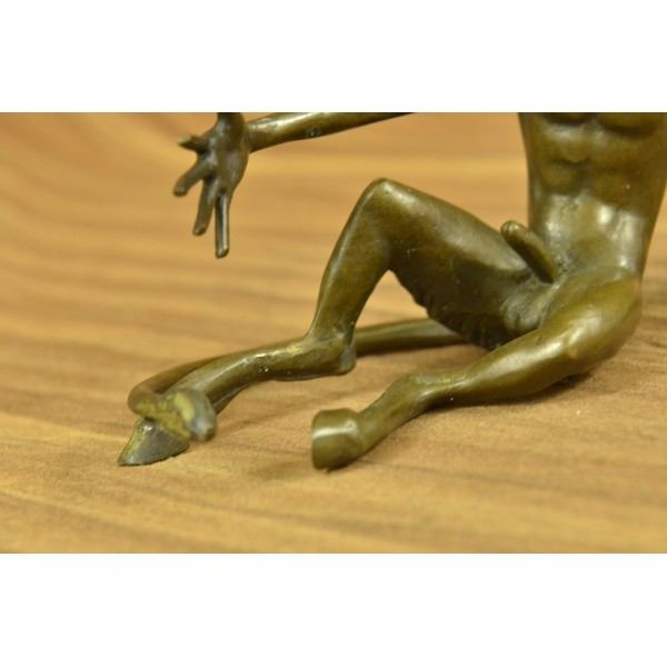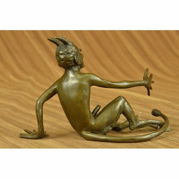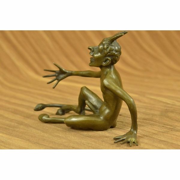 This creepy and very scary satyr is chasing around a nymph, but she is not interesting in him and his overly persisting arouse self. She is happy with her main Satyr, but has not taking no for an answer chasing her all around. His arms and hands are extended and spread out as he is trying to grab something or someone. His devil face and horns are very frightening to look at. This Satyr mythological creature could not be completely understand. This sculpture is made from solid bronze and was casted using the "Lost Wax Method". It has a brown patina for preservation and is signed Milo. Condition: This sculpture is in perfect condition. Bronze Dimensions :Height 5" x Width 7" Weight : 2 LBS Inventory :21YRD12122212