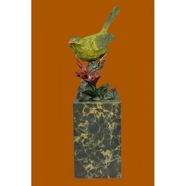 Birds of paradise. perched on a brown marble base, the breathtaking multi color finches figurines are a testament to nature's beauty, featuring wings of vibrantly colored real bronze. It is a great gift for nature lovers, fisherman, hunters and country dwellers. It may even be a sweet gesture to a lovely devoted couple on their golden anniversary. This brown patina sculpture was cast using the lost wax method and mounted on a brown marble base. Bronze dimensions with marble base: Height 11 X Width 5 inches. Weight: 5 lbs.Please Note: This is a reproduction bronze sculpture from the original molded and signed. This featured bronze sculpture is a recast after the original, and has been done recently. This 100% bronze sculpture is an abstract piece certain to be a conversation piece.Please Note: This is a reproduction bronze sculpture from the original molded and signed. This featured bronze sculpture is a recast after the original, and has been done recently. This 100% bronze sculpture is an abstract piece certain to be a conversation piece.