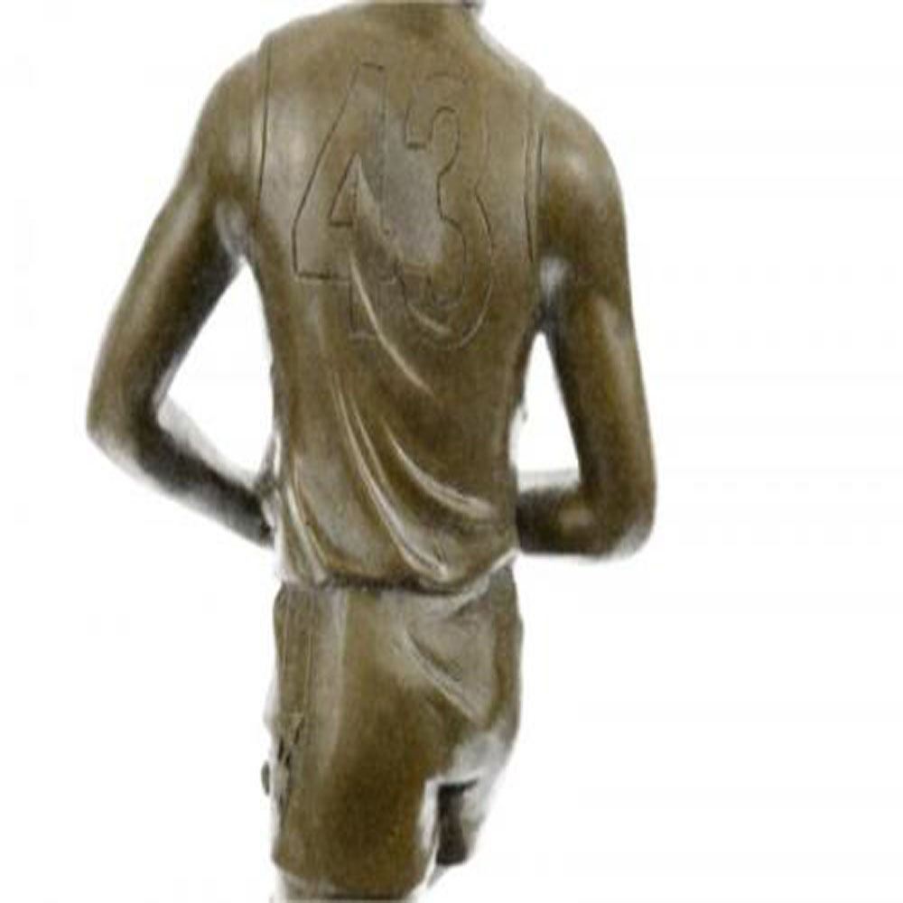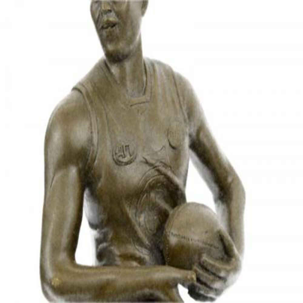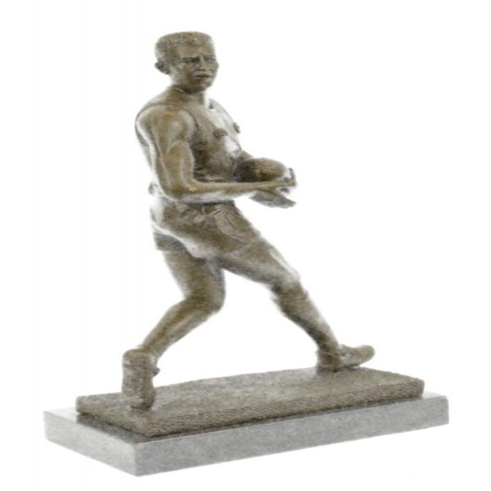 A muscular Rugby player runs for the end field, trying to skip the yards and avoid being tackled. His powerful legs ache as he sprints and dodges. He Kicked the ball under his protectively. Every once in a while he glances over his shoulder to see how close his opponents are. He eyes the white touch down line. He can hear another player barreling down on him. He glances to his teammate and prepares to hand the ball over, sacrificing himself for the win. This brown patina sculpture was cast using the Lost Wax Method and mounted on a marble base. Dimensions: Height 15 X Width 9 inches. Weight: 12 LBS.