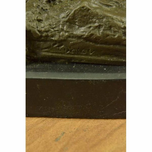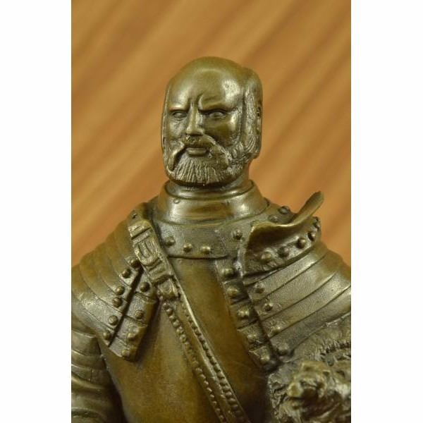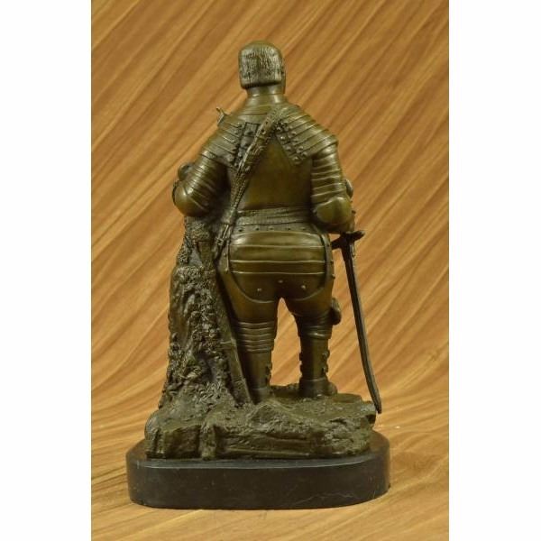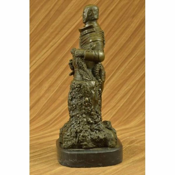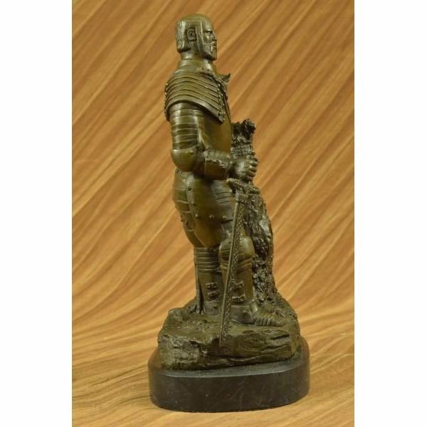 This European Warrior stand in a fighting pose ready to attack whomever comes close. He protects himself with his sword, as he stands on top some stoops he does not show any look of fear in fact he has a look of power and strength. Anyone will look at this amazing piece of art and stare in awe of how much details it has, from his weapons to his armor to the knee caps shields to the helmet that details are astonishing. 100% bronze and handmade, this brown patina sculpture was cast using the "Lost Wax Method" and mounted on a marble base. It is signed by the artist Dalov. Condition: This sculpture is in perfect condition. Bronze Dimensions with Marble Base:Height 12" x Width 7" Marble Dimensions:Diameter 7" Height without base: 11" Weight :10 LBS Inventory : 74DS5165947