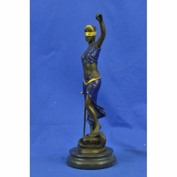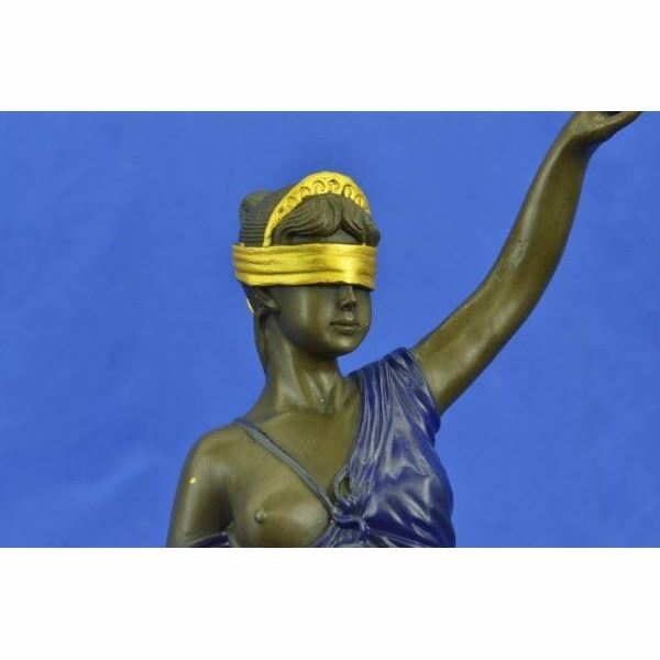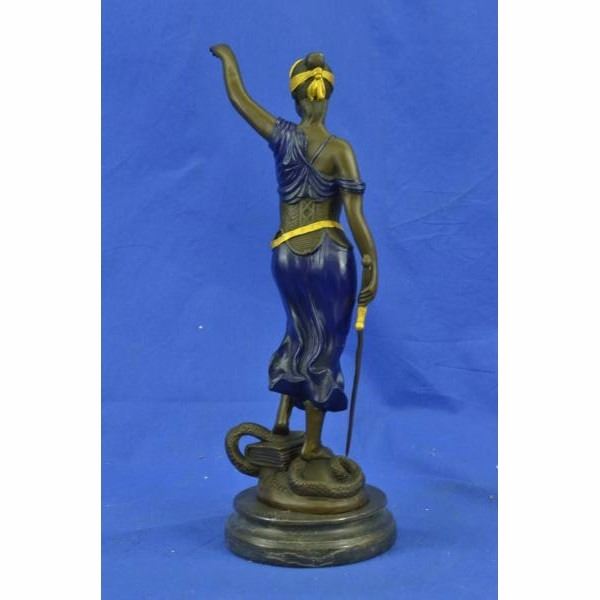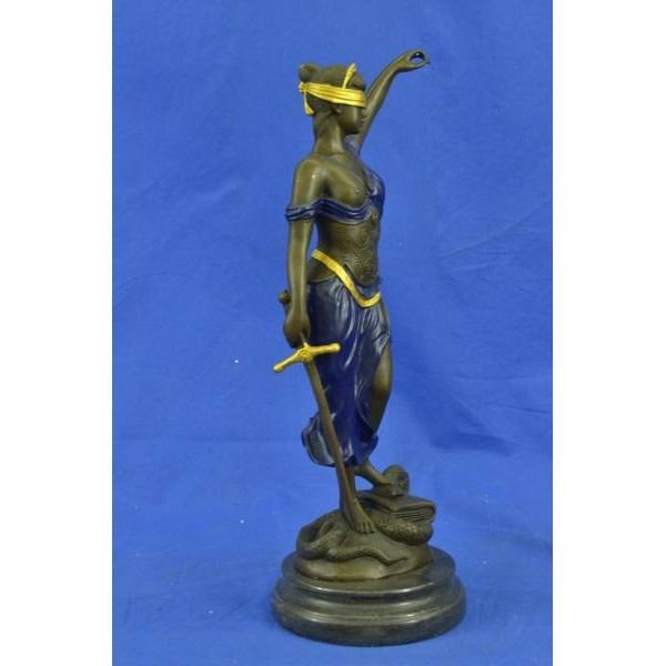 The bronze sculpture is of Lady Justice (Roman goddess of Justice) who is the symbolic personification of the moral force in judicial systems. As anciently depicted, the blindfolded Lady Justice, is seen balancing the scales of truth and fairness from her left hand, holding a sword, while stepping on a book and a snake that coils around her feet. The scales, represent truth and fairness and measures the strength of a case's support and opposition. The blindfold, represents objectivity, in that justice is (or should be) meted out objectively without biases. The sword, symbolizes the power of reason and justice, which may be wielded either for or against any party.The book represents history; signifying to stand against wrongdoings or with the good doings of the past. The snake symbolizes hatred hence the foot that stops it from getting its grip. She was captured using the age-old method of lost-wax casting and stained with a brown patina finish. She is mounted upon a black marble base. Condition: This sculpture is in perfect condition. Bronze Dimensions with Marble Base:Height 18" x Width 9" Marble Dimensions: Diameter 5" Height without base: 17" Weight : 10LBS Inventory : 39Y026-6C6323