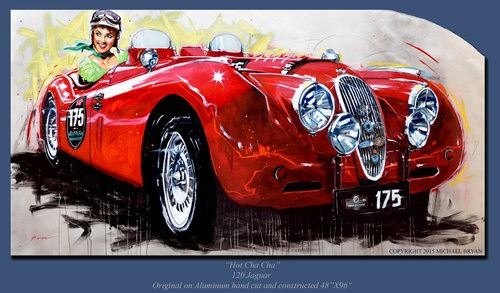 Is it the Jaguar or the gal that's a "Hot Cha Cha " in this Michael Bryan tribute to car & driver. This is a 20x40" handworked giclee on canvas, numbered 1/1 Unique.