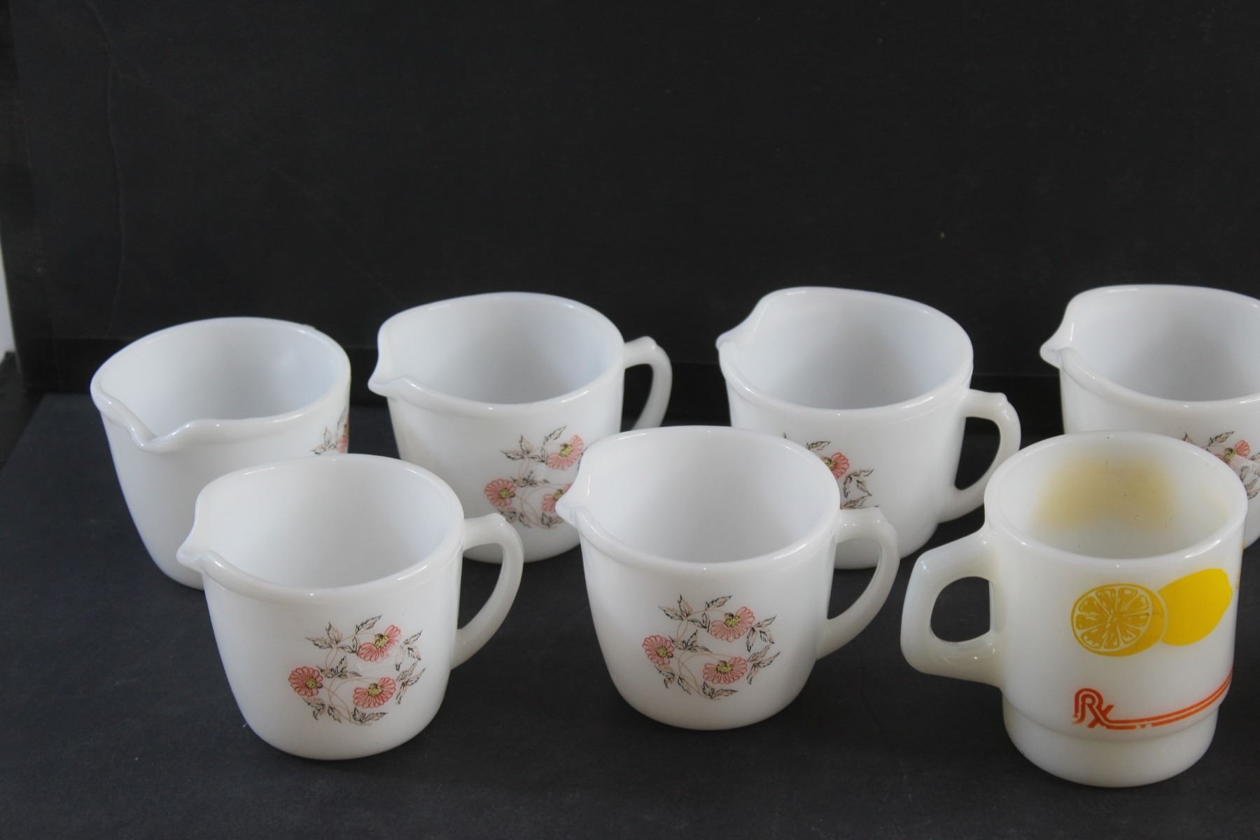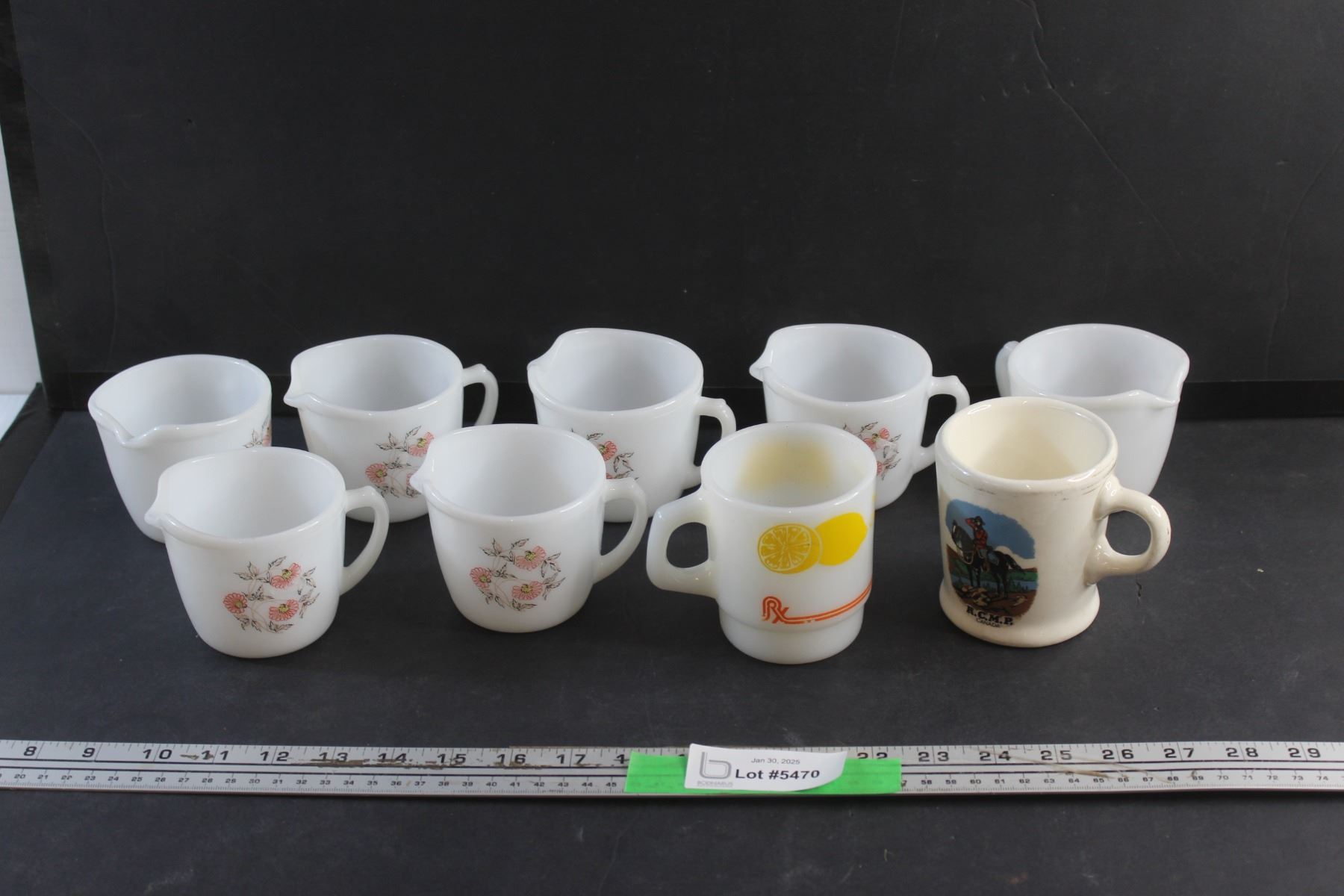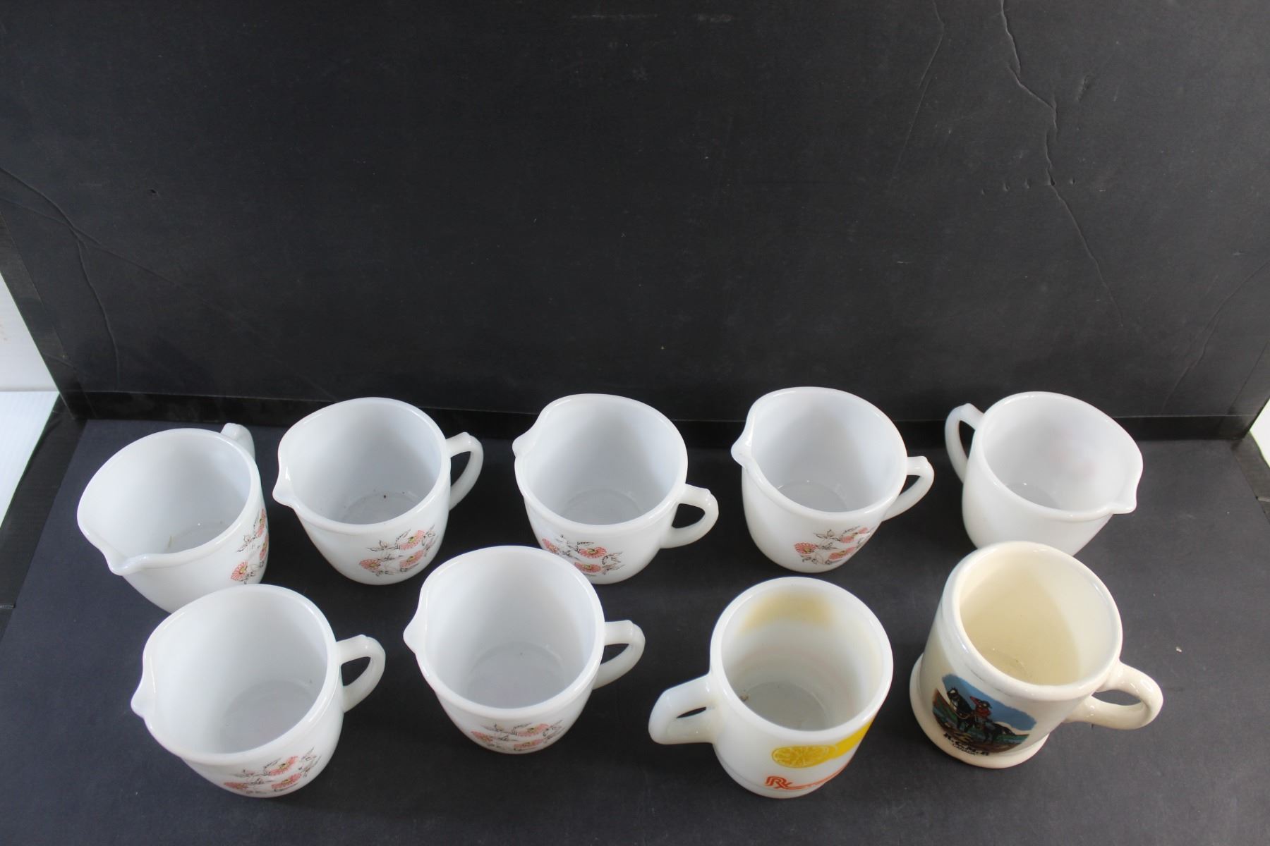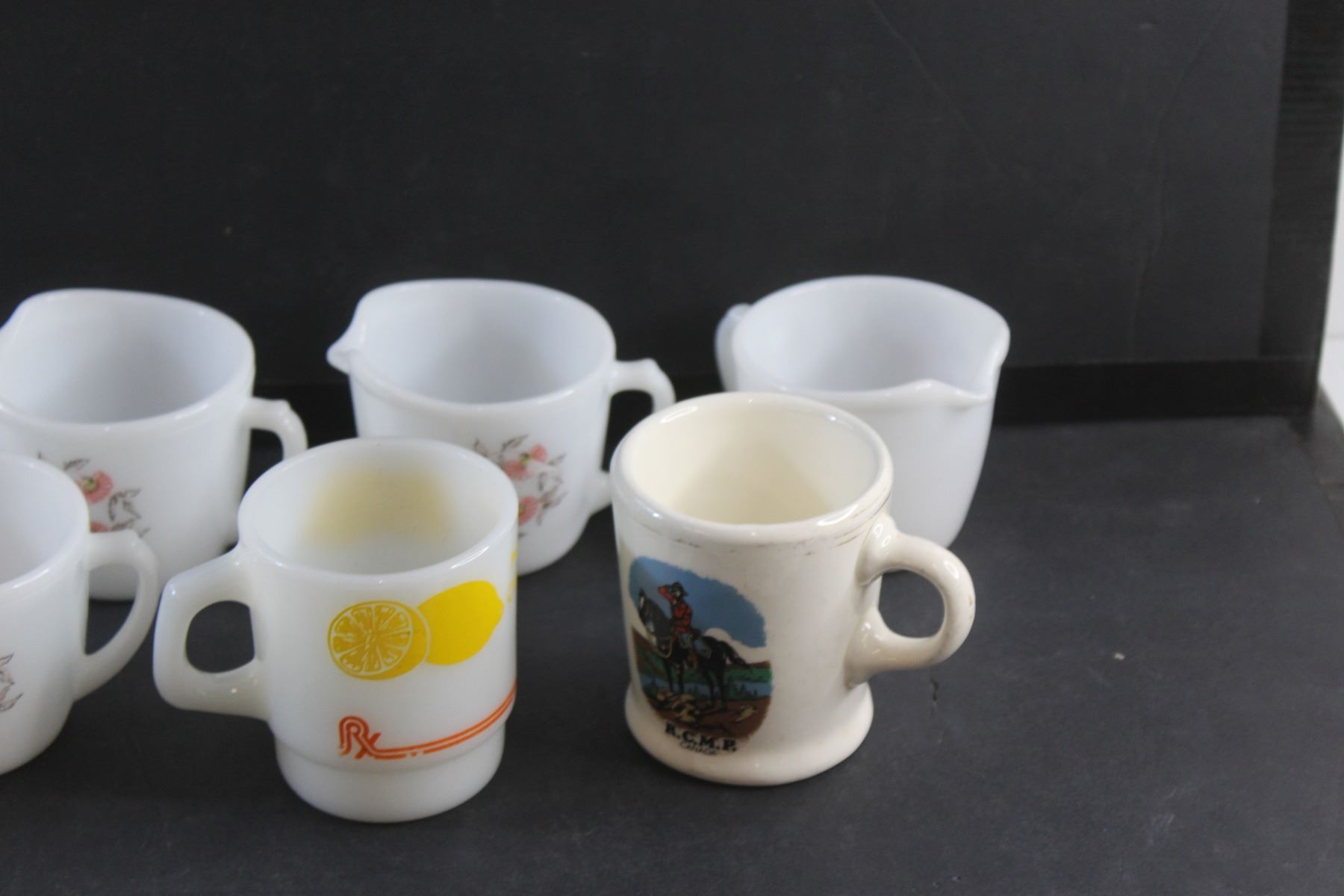 Hot Lemon and RCMP Mugs and (7) Milk Glass Creamer Cups