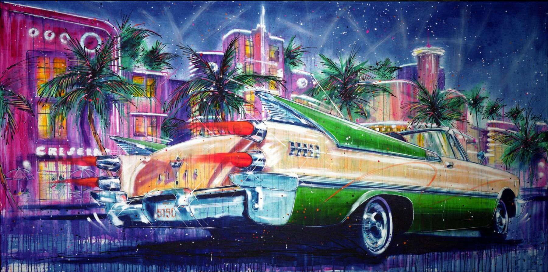 Michael Bryan takes us to South Beach again, this time for a tribute to hot cars and hot nights, in a 20x40" handworked giclee on canvas, numbered 1/1.