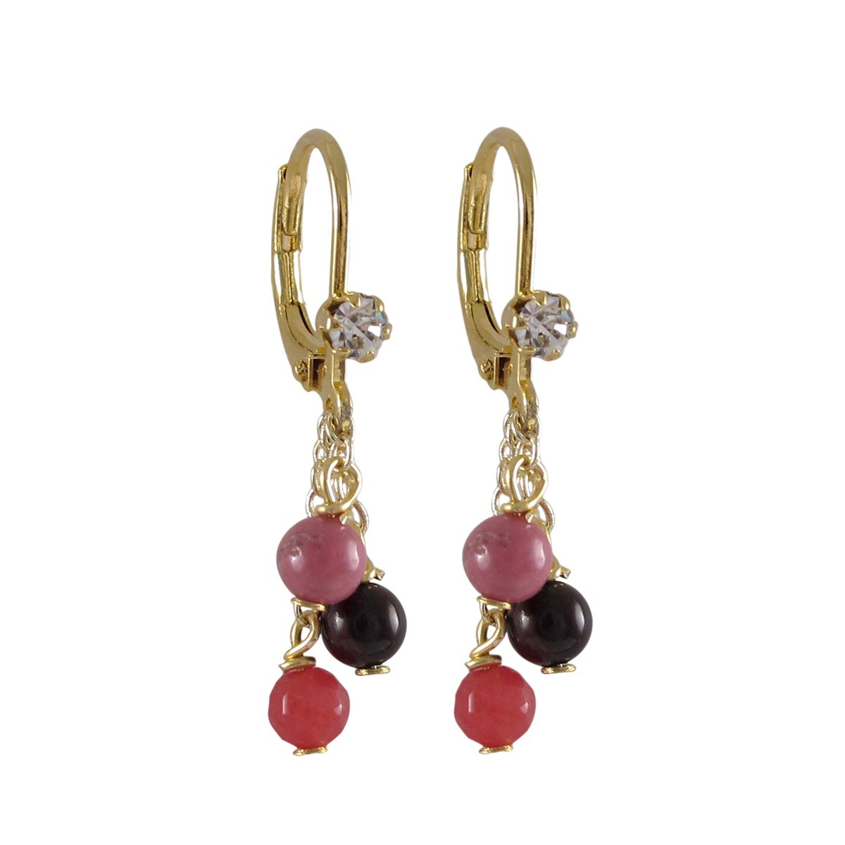Hot Pink Combination Semi Precious 4Mm Balls Dangling, Gold Plated Surgical Steel Lever Back With White Crystal Earrings, 1.14"
