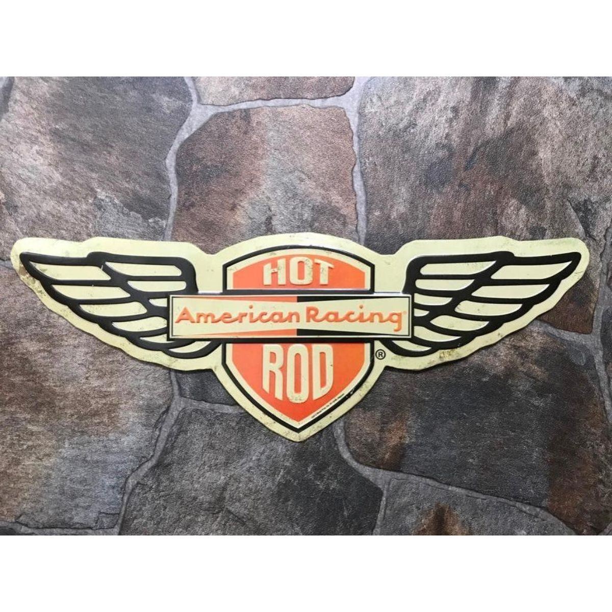 American Racing, Hot Rod, metal garage or pub bar sign, with hanger mounts on the reverse side. 21" W x 7 1/2" L.
