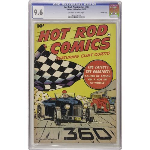 <B>Hot Rod Comics #nn (#1) Crowley Copy pedigree (Fawcett, 1951) CGC NM+ 9.6 Off-white to white pages.</B></I> Several publishers tried their hand at a hot rod comic book in the early 1950s, but Fawcett had a leg up on the rest thanks to the services of Bob Powell, who provided both cover and interior art here. This is the highest graded copy to date. Overstreet 2006 NM- 9.2 value = $330. CGC census 10/06: 1 in 9.6, none higher.<BR><BR><b>Shipping:</b> Slabbed Comic (<a target="_blank" href="http://www.heritageauctions.com/common/shipping.php">view shipping information</a>)