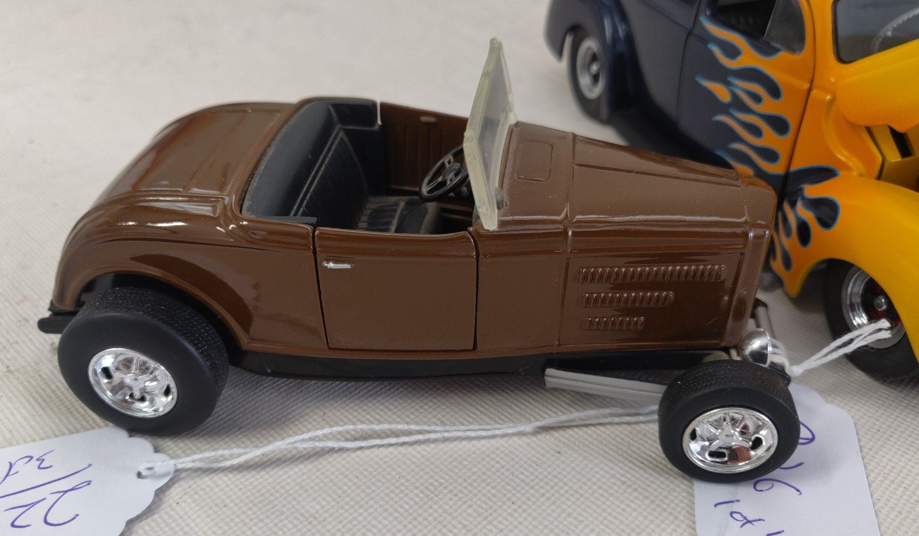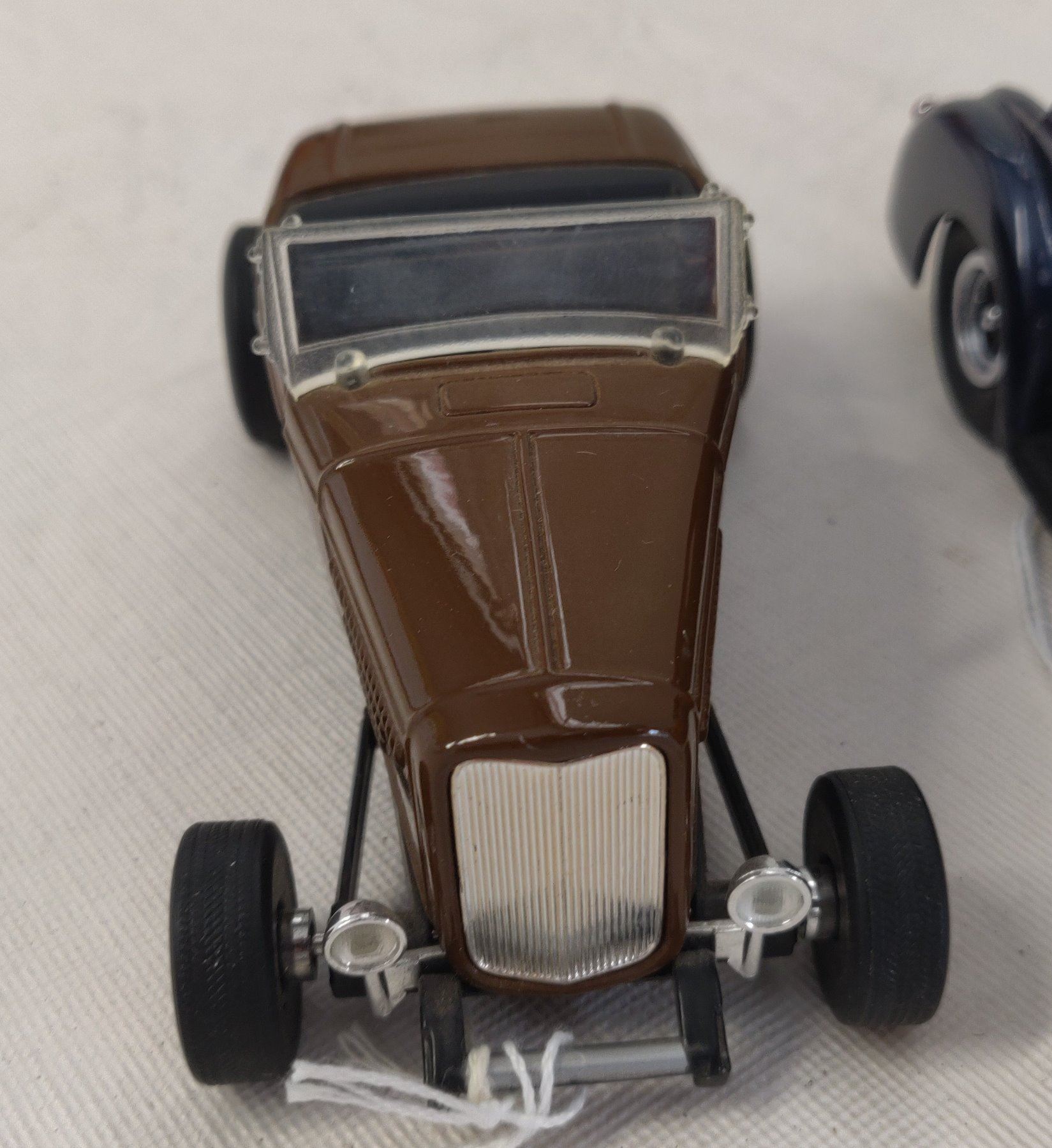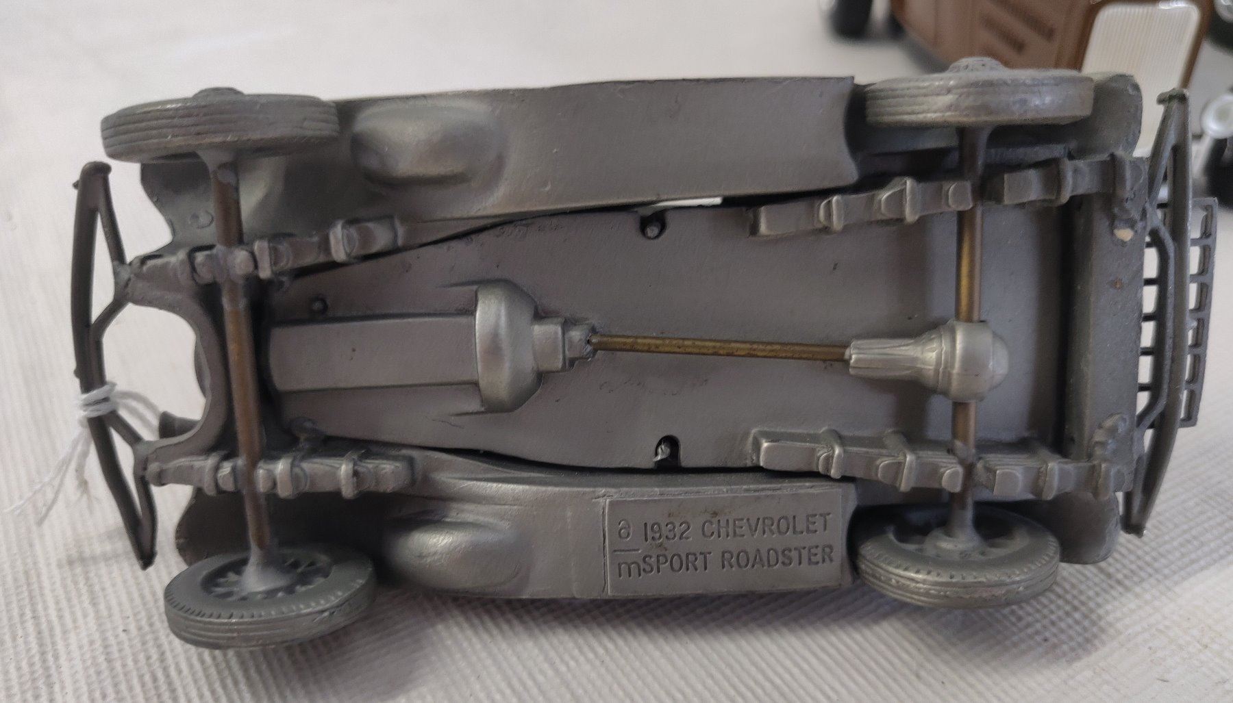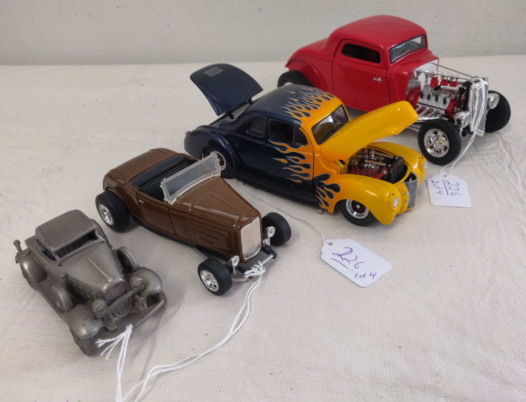 Hot Rod Model Toy Collection, modern items. Made of die cast metal and plastic, the items measure 4 3/8" to 7 7/8' long. China. Included are a 1932 Ford High boy in 1:27 scale ratio by SmartToys, a 1932 Chevy Sport Roadster (heavy item), a 1940 Ford Hot Rod by Danbury Mint w/box, and a 1930s Ford Roadster by ERTL in red. Condition: Good, see images. Shipping: $34.50 w/insurance and signature.