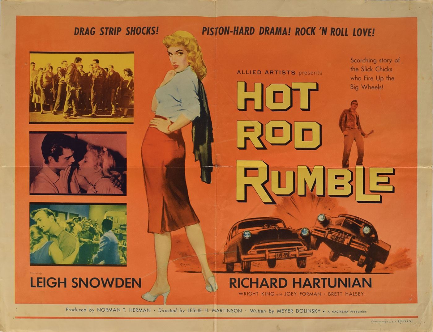 Original color 28 x 22 half-sheet movie poster for the 1957 crime film Hot Rod Rumble, showing three scenes along the left side, two cars crashing, an artistic depiction of Leigh Snowden, and text to upper portion reading: "Drag Strip Shocks! Piston-Hard Drama! Rock 'N Roll Love! Scorching story of the Slick Chicks who Fire Up the Big Wheels!" Folded and in very good condition, with staple holes to the corners, a scratch that passes across Snowden's lower legs, creasing along the vertical fold, and splitting and paper loss at the fold intersections.