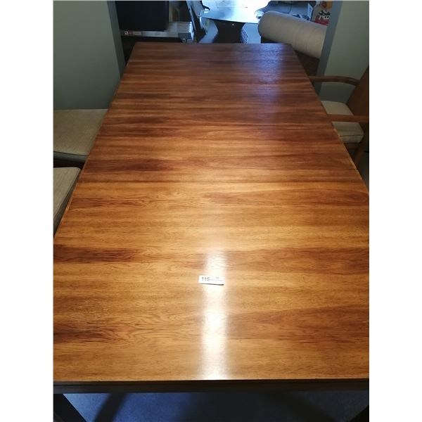 Tables has two leaves, each adding 15" to the length of the table. 82" long (w/ leaves) and 40" wide