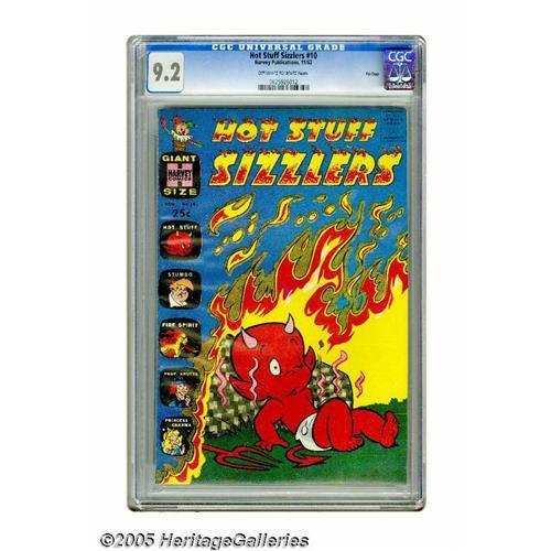 <B>Hot Stuff Sizzlers #10 File Copy (Harvey, 1962) CGC NM- 9.2 Off-white to white pages.</B></I> Overstreet 2005 NM- 9.2 value = $65. CGC census 8/05: 1 in 9.2, none higher. <BR><BR><B>Important notice:</B> Heritage usually auctions material at the rate of 200-250 lots per hour. On some occasions eBay Live bid software or the Internet may not be able to keep up with the pace of the auction. We recommend placing a realistic absentee bid now as insurance to avoid disappointment. Occasionally the auctioneer may eliminate or reject an eBay Live bid, and the auctioneer may also reopen a lot after the close of the eBay live bidding (usually because we missed an audience bid), and may reject your bid even if it shows you as the winning bidder. By bidding via eBay Live, you agree that Heritage may award the lot to another bidder at its sole discretion under the circumstances described above or any other reasonable circumstances. Since eBay bids are not shown to us until we open the lot on the floor, we treat those bids just like floor bids. In most cases the floor responds before the eBay bid is presented to us, due to Internet lag time, so for consistency we have made it a policy that floor bids are always considered first over tie eBay live bids. Also please note that all Heritage lots purchased through eBay Live carry a 20% Buyer's Premium. Please make sure you read the Terms and Conditions before you bid. This lot is being auctioned in conjunction with a live floor auction by Heritage Galleries & Auctioneers. All final auction and invoice information will be supplied by Heritage Galleries & Auctioneers, and all other information should be considered preliminary. Lot:1419 <BR><BR><B>Winning Notification and Billing:</B> After the FINAL session in this auction is complete, Heritage will send e-mail and snail mail invoices. This process normally takes several days. All final auction and invoice information will be supplied by Heritage Galleries & Auctioneers, and all other