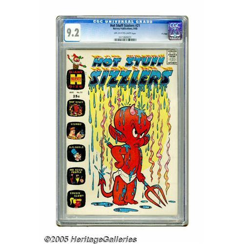 <B>Hot Stuff Sizzlers #21 File Copy (Harvey, 1965) CGC NM- 9.2 Off-white to white pages.</B></I> Overstreet 2005 NM- 9.2 value = $32. CGC census 8/05: 1 in 9.2, none higher. <BR><BR><B>Important notice:</B> Heritage usually auctions material at the rate of 200-250 lots per hour. On some occasions eBay Live bid software or the Internet may not be able to keep up with the pace of the auction. We recommend placing a realistic absentee bid now as insurance to avoid disappointment. Occasionally the auctioneer may eliminate or reject an eBay Live bid, and the auctioneer may also reopen a lot after the close of the eBay live bidding (usually because we missed an audience bid), and may reject your bid even if it shows you as the winning bidder. By bidding via eBay Live, you agree that Heritage may award the lot to another bidder at its sole discretion under the circumstances described above or any other reasonable circumstances. Since eBay bids are not shown to us until we open the lot on the floor, we treat those bids just like floor bids. In most cases the floor responds before the eBay bid is presented to us, due to Internet lag time, so for consistency we have made it a policy that floor bids are always considered first over tie eBay live bids. Also please note that all Heritage lots purchased through eBay Live carry a 20% Buyer's Premium. Please make sure you read the Terms and Conditions before you bid. This lot is being auctioned in conjunction with a live floor auction by Heritage Galleries & Auctioneers. All final auction and invoice information will be supplied by Heritage Galleries & Auctioneers, and all other information should be considered preliminary. Lot:1428 <BR><BR><B>Winning Notification and Billing:</B> After the FINAL session in this auction is complete, Heritage will send e-mail and snail mail invoices. This process normally takes several days. All final auction and invoice information will be supplied by Heritage Galleries & Auctioneers, and all other