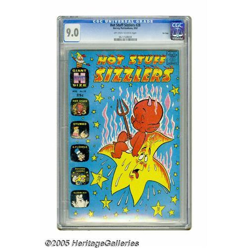 <B>Hot Stuff Sizzlers #28 File Copy (Harvey, 1967) CGC VF/NM 9.0 Off-white to white pages.</B></I> Overstreet 2005 VF/NM 9.0 value = $25; NM- 9.2 value = $32. CGC census 8/05: 1 in 9.0, none higher. <BR><BR><B>Important notice:</B> Heritage usually auctions material at the rate of 200-250 lots per hour. On some occasions eBay Live bid software or the Internet may not be able to keep up with the pace of the auction. We recommend placing a realistic absentee bid now as insurance to avoid disappointment. Occasionally the auctioneer may eliminate or reject an eBay Live bid, and the auctioneer may also reopen a lot after the close of the eBay live bidding (usually because we missed an audience bid), and may reject your bid even if it shows you as the winning bidder. By bidding via eBay Live, you agree that Heritage may award the lot to another bidder at its sole discretion under the circumstances described above or any other reasonable circumstances. Since eBay bids are not shown to us until we open the lot on the floor, we treat those bids just like floor bids. In most cases the floor responds before the eBay bid is presented to us, due to Internet lag time, so for consistency we have made it a policy that floor bids are always considered first over tie eBay live bids. Also please note that all Heritage lots purchased through eBay Live carry a 20% Buyer's Premium. Please make sure you read the Terms and Conditions before you bid. This lot is being auctioned in conjunction with a live floor auction by Heritage Galleries & Auctioneers. All final auction and invoice information will be supplied by Heritage Galleries & Auctioneers, and all other information should be considered preliminary. Lot:1431 <BR><BR><B>Winning Notification and Billing:</B> After the FINAL session in this auction is complete, Heritage will send e-mail and snail mail invoices. This process normally takes several days. All final auction and invoice information will be supplied by Heritage Galleries & A