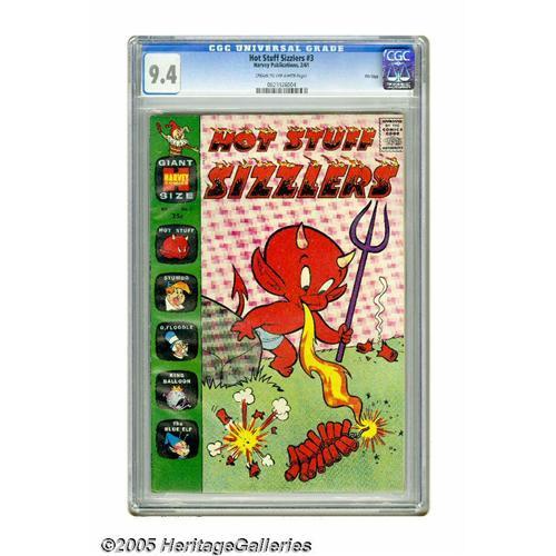 <B>Hot Stuff Sizzlers #3 File Copy (Harvey, 1961) CGC NM 9.4 Cream to off-white pages.</B></I> Overstreet 2005 NM- 9.2 value = $95. CGC census 8/05: 1 in 9.4, none higher. <BR><BR><B>Important notice:</B> Heritage usually auctions material at the rate of 200-250 lots per hour. On some occasions eBay Live bid software or the Internet may not be able to keep up with the pace of the auction. We recommend placing a realistic absentee bid now as insurance to avoid disappointment. Occasionally the auctioneer may eliminate or reject an eBay Live bid, and the auctioneer may also reopen a lot after the close of the eBay live bidding (usually because we missed an audience bid), and may reject your bid even if it shows you as the winning bidder. By bidding via eBay Live, you agree that Heritage may award the lot to another bidder at its sole discretion under the circumstances described above or any other reasonable circumstances. Since eBay bids are not shown to us until we open the lot on the floor, we treat those bids just like floor bids. In most cases the floor responds before the eBay bid is presented to us, due to Internet lag time, so for consistency we have made it a policy that floor bids are always considered first over tie eBay live bids. Also please note that all Heritage lots purchased through eBay Live carry a 20% Buyer's Premium. Please make sure you read the Terms and Conditions before you bid. This lot is being auctioned in conjunction with a live floor auction by Heritage Galleries & Auctioneers. All final auction and invoice information will be supplied by Heritage Galleries & Auctioneers, and all other information should be considered preliminary. Lot:1414 <BR><BR><B>Winning Notification and Billing:</B> After the FINAL session in this auction is complete, Heritage will send e-mail and snail mail invoices. This process normally takes several days. All final auction and invoice information will be supplied by Heritage Galleries & Auctioneers, and all other i