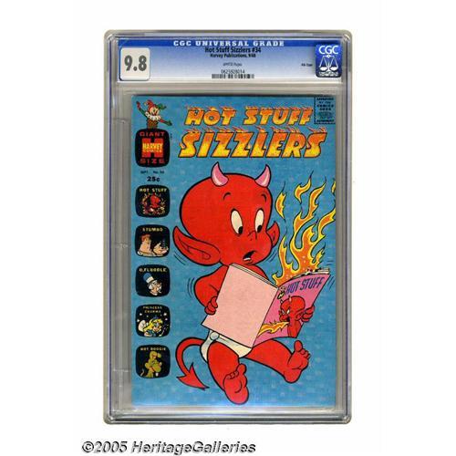 <B>Hot Stuff Sizzlers #34 File Copy (Harvey, 1968) CGC NM/MT 9.8 White pages.</B></I> Overstreet 2005 NM- 9.2 value = $32. CGC census 9/05: 1 in 9.8, none higher. <BR><BR><B>Important notice:</B> Heritage usually auctions material at the rate of 200-250 lots per hour. On some occasions eBay Live bid software or the Internet may not be able to keep up with the pace of the auction. We recommend placing a realistic absentee bid now as insurance to avoid disappointment. Occasionally the auctioneer may eliminate or reject an eBay Live bid, and the auctioneer may also reopen a lot after the close of the eBay live bidding (usually because we missed an audience bid), and may reject your bid even if it shows you as the winning bidder. By bidding via eBay Live, you agree that Heritage may award the lot to another bidder at its sole discretion under the circumstances described above or any other reasonable circumstances. Since eBay bids are not shown to us until we open the lot on the floor, we treat those bids just like floor bids. In most cases the floor responds before the eBay bid is presented to us, due to Internet lag time, so for consistency we have made it a policy that floor bids are always considered first over tie eBay live bids. Also please note that all Heritage lots purchased through eBay Live carry a 20% Buyer's Premium. Please make sure you read the Terms and Conditions before you bid. This lot is being auctioned in conjunction with a live floor auction by Heritage Galleries & Auctioneers. All final auction and invoice information will be supplied by Heritage Galleries & Auctioneers, and all other information should be considered preliminary. Lot:1436 <BR><BR><B>Winning Notification and Billing:</B> After the FINAL session in this auction is complete, Heritage will send e-mail and snail mail invoices. This process normally takes several days. All final auction and invoice information will be supplied by Heritage Galleries & Auctioneers, and all other informatio