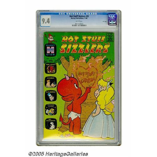 <B>Hot Stuff Sizzlers #35 File Copy (Harvey, 1968) CGC NM 9.4 White pages.</B></I> Overstreet 2005 NM- 9.2 value = $32. CGC census 9/05: 1 in 9.4, none higher. <BR><BR><B>Important notice:</B> Heritage usually auctions material at the rate of 200-250 lots per hour. On some occasions eBay Live bid software or the Internet may not be able to keep up with the pace of the auction. We recommend placing a realistic absentee bid now as insurance to avoid disappointment. Occasionally the auctioneer may eliminate or reject an eBay Live bid, and the auctioneer may also reopen a lot after the close of the eBay live bidding (usually because we missed an audience bid), and may reject your bid even if it shows you as the winning bidder. By bidding via eBay Live, you agree that Heritage may award the lot to another bidder at its sole discretion under the circumstances described above or any other reasonable circumstances. Since eBay bids are not shown to us until we open the lot on the floor, we treat those bids just like floor bids. In most cases the floor responds before the eBay bid is presented to us, due to Internet lag time, so for consistency we have made it a policy that floor bids are always considered first over tie eBay live bids. Also please note that all Heritage lots purchased through eBay Live carry a 20% Buyer's Premium. Please make sure you read the Terms and Conditions before you bid. This lot is being auctioned in conjunction with a live floor auction by Heritage Galleries & Auctioneers. All final auction and invoice information will be supplied by Heritage Galleries & Auctioneers, and all other information should be considered preliminary. Lot:1437 <BR><BR><B>Winning Notification and Billing:</B> After the FINAL session in this auction is complete, Heritage will send e-mail and snail mail invoices. This process normally takes several days. All final auction and invoice information will be supplied by Heritage Galleries & Auctioneers, and all other information s