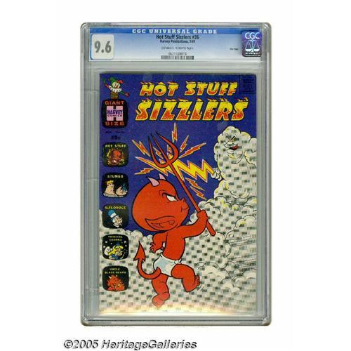 <B>Hot Stuff Sizzlers #36 File Copy (Harvey, 1969) CGC NM+ 9.6 Off-white to white pages.</B></I> Overstreet 2005 NM- 9.2 value = $32. CGC census 9/05: 1 in 9.6, none higher. <BR><BR><B>Important notice:</B> Heritage usually auctions material at the rate of 200-250 lots per hour. On some occasions eBay Live bid software or the Internet may not be able to keep up with the pace of the auction. We recommend placing a realistic absentee bid now as insurance to avoid disappointment. Occasionally the auctioneer may eliminate or reject an eBay Live bid, and the auctioneer may also reopen a lot after the close of the eBay live bidding (usually because we missed an audience bid), and may reject your bid even if it shows you as the winning bidder. By bidding via eBay Live, you agree that Heritage may award the lot to another bidder at its sole discretion under the circumstances described above or any other reasonable circumstances. Since eBay bids are not shown to us until we open the lot on the floor, we treat those bids just like floor bids. In most cases the floor responds before the eBay bid is presented to us, due to Internet lag time, so for consistency we have made it a policy that floor bids are always considered first over tie eBay live bids. Also please note that all Heritage lots purchased through eBay Live carry a 20% Buyer's Premium. Please make sure you read the Terms and Conditions before you bid. This lot is being auctioned in conjunction with a live floor auction by Heritage Galleries & Auctioneers. All final auction and invoice information will be supplied by Heritage Galleries & Auctioneers, and all other information should be considered preliminary. Lot:1438 <BR><BR><B>Winning Notification and Billing:</B> After the FINAL session in this auction is complete, Heritage will send e-mail and snail mail invoices. This process normally takes several days. All final auction and invoice information will be supplied by Heritage Galleries & Auctioneers, and all other