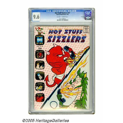 <B>Hot Stuff Sizzlers #37 File Copy (Harvey, 1969) CGC NM+ 9.6 Off-white to white pages.</B></I> Overstreet 2005 NM- 9.2 value = $32. CGC census 9/05: 1 in 9.6, none higher. <BR><BR><B>Important notice:</B> Heritage usually auctions material at the rate of 200-250 lots per hour. On some occasions eBay Live bid software or the Internet may not be able to keep up with the pace of the auction. We recommend placing a realistic absentee bid now as insurance to avoid disappointment. Occasionally the auctioneer may eliminate or reject an eBay Live bid, and the auctioneer may also reopen a lot after the close of the eBay live bidding (usually because we missed an audience bid), and may reject your bid even if it shows you as the winning bidder. By bidding via eBay Live, you agree that Heritage may award the lot to another bidder at its sole discretion under the circumstances described above or any other reasonable circumstances. Since eBay bids are not shown to us until we open the lot on the floor, we treat those bids just like floor bids. In most cases the floor responds before the eBay bid is presented to us, due to Internet lag time, so for consistency we have made it a policy that floor bids are always considered first over tie eBay live bids. Also please note that all Heritage lots purchased through eBay Live carry a 20% Buyer's Premium. Please make sure you read the Terms and Conditions before you bid. This lot is being auctioned in conjunction with a live floor auction by Heritage Galleries & Auctioneers. All final auction and invoice information will be supplied by Heritage Galleries & Auctioneers, and all other information should be considered preliminary. Lot:1439 <BR><BR><B>Winning Notification and Billing:</B> After the FINAL session in this auction is complete, Heritage will send e-mail and snail mail invoices. This process normally takes several days. All final auction and invoice information will be supplied by Heritage Galleries & Auctioneers, and all other