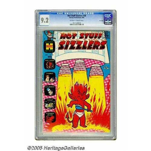 <B>Hot Stuff Sizzlers #38 File Copy (Harvey, 1969) CGC NM- 9.2 Off-white to white pages.</B></I> Overstreet 2005 NM- 9.2 value = $32. CGC census 9/05: 1 in 9.2, none higher. <BR><BR><B>Important notice:</B> Heritage usually auctions material at the rate of 200-250 lots per hour. On some occasions eBay Live bid software or the Internet may not be able to keep up with the pace of the auction. We recommend placing a realistic absentee bid now as insurance to avoid disappointment. Occasionally the auctioneer may eliminate or reject an eBay Live bid, and the auctioneer may also reopen a lot after the close of the eBay live bidding (usually because we missed an audience bid), and may reject your bid even if it shows you as the winning bidder. By bidding via eBay Live, you agree that Heritage may award the lot to another bidder at its sole discretion under the circumstances described above or any other reasonable circumstances. Since eBay bids are not shown to us until we open the lot on the floor, we treat those bids just like floor bids. In most cases the floor responds before the eBay bid is presented to us, due to Internet lag time, so for consistency we have made it a policy that floor bids are always considered first over tie eBay live bids. Also please note that all Heritage lots purchased through eBay Live carry a 20% Buyer's Premium. Please make sure you read the Terms and Conditions before you bid. This lot is being auctioned in conjunction with a live floor auction by Heritage Galleries & Auctioneers. All final auction and invoice information will be supplied by Heritage Galleries & Auctioneers, and all other information should be considered preliminary. Lot:1441 <BR><BR><B>Winning Notification and Billing:</B> After the FINAL session in this auction is complete, Heritage will send e-mail and snail mail invoices. This process normally takes several days. All final auction and invoice information will be supplied by Heritage Galleries & Auctioneers, and all other