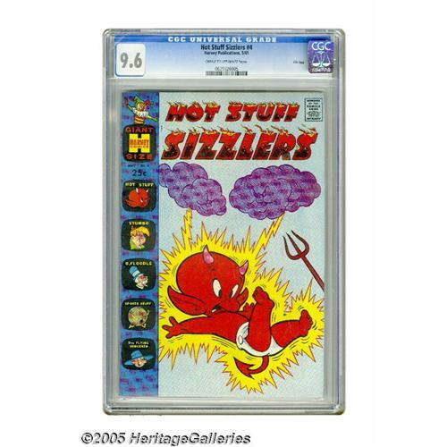 <B>Hot Stuff Sizzlers #4 File Copy (Harvey, 1961) CGC NM+ 9.6 Cream to off-white pages.</B></I> Overstreet 2005 NM- 9.2 value = $65. CGC census 8/05: 1 in 9.6, none higher. <BR><BR><B>Important notice:</B> Heritage usually auctions material at the rate of 200-250 lots per hour. On some occasions eBay Live bid software or the Internet may not be able to keep up with the pace of the auction. We recommend placing a realistic absentee bid now as insurance to avoid disappointment. Occasionally the auctioneer may eliminate or reject an eBay Live bid, and the auctioneer may also reopen a lot after the close of the eBay live bidding (usually because we missed an audience bid), and may reject your bid even if it shows you as the winning bidder. By bidding via eBay Live, you agree that Heritage may award the lot to another bidder at its sole discretion under the circumstances described above or any other reasonable circumstances. Since eBay bids are not shown to us until we open the lot on the floor, we treat those bids just like floor bids. In most cases the floor responds before the eBay bid is presented to us, due to Internet lag time, so for consistency we have made it a policy that floor bids are always considered first over tie eBay live bids. Also please note that all Heritage lots purchased through eBay Live carry a 20% Buyer's Premium. Please make sure you read the Terms and Conditions before you bid. This lot is being auctioned in conjunction with a live floor auction by Heritage Galleries & Auctioneers. All final auction and invoice information will be supplied by Heritage Galleries & Auctioneers, and all other information should be considered preliminary. Lot:1415 <BR><BR><B>Winning Notification and Billing:</B> After the FINAL session in this auction is complete, Heritage will send e-mail and snail mail invoices. This process normally takes several days. All final auction and invoice information will be supplied by Heritage Galleries & Auctioneers, and all other