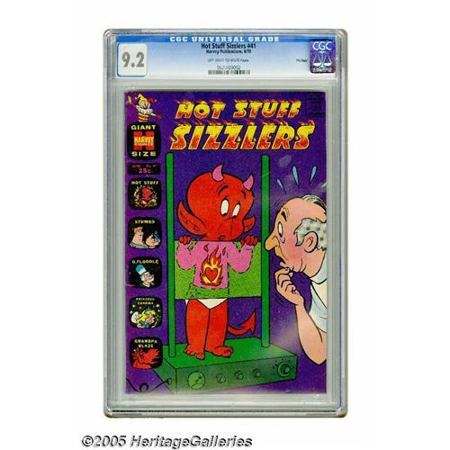 <B>Hot Stuff Sizzlers #41 File Copy (Harvey, 1970) CGC NM- 9.2 Off-white to white pages.</B></I> Overstreet 2005 NM- 9.2 value = $32. CGC census 9/05: 1 in 9.2, none higher. <BR><BR><B>Important notice:</B> Heritage usually auctions material at the rate of 200-250 lots per hour. On some occasions eBay Live bid software or the Internet may not be able to keep up with the pace of the auction. We recommend placing a realistic absentee bid now as insurance to avoid disappointment. Occasionally the auctioneer may eliminate or reject an eBay Live bid, and the auctioneer may also reopen a lot after the close of the eBay live bidding (usually because we missed an audience bid), and may reject your bid even if it shows you as the winning bidder. By bidding via eBay Live, you agree that Heritage may award the lot to another bidder at its sole discretion under the circumstances described above or any other reasonable circumstances. Since eBay bids are not shown to us until we open the lot on the floor, we treat those bids just like floor bids. In most cases the floor responds before the eBay bid is presented to us, due to Internet lag time, so for consistency we have made it a policy that floor bids are always considered first over tie eBay live bids. Also please note that all Heritage lots purchased through eBay Live carry a 20% Buyer's Premium. Please make sure you read the Terms and Conditions before you bid. This lot is being auctioned in conjunction with a live floor auction by Heritage Galleries & Auctioneers. All final auction and invoice information will be supplied by Heritage Galleries & Auctioneers, and all other information should be considered preliminary. Lot:1444 <BR><BR><B>Winning Notification and Billing:</B> After the FINAL session in this auction is complete, Heritage will send e-mail and snail mail invoices. This process normally takes several days. All final auction and invoice information will be supplied by Heritage Galleries & Auctioneers, and all other