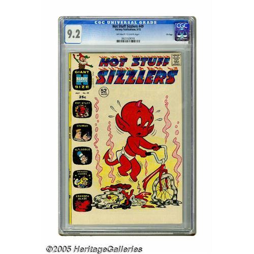 <B>Hot Stuff Sizzlers #49 File Copy (Harvey, 1972) CGC NM- 9.2 Off-white to white pages.</B></I> Overstreet 2005 NM- 9.2 value = $24. CGC census 9/05: 1 in 9.2, none higher. <BR><BR><B>Important notice:</B> Heritage usually auctions material at the rate of 200-250 lots per hour. On some occasions eBay Live bid software or the Internet may not be able to keep up with the pace of the auction. We recommend placing a realistic absentee bid now as insurance to avoid disappointment. Occasionally the auctioneer may eliminate or reject an eBay Live bid, and the auctioneer may also reopen a lot after the close of the eBay live bidding (usually because we missed an audience bid), and may reject your bid even if it shows you as the winning bidder. By bidding via eBay Live, you agree that Heritage may award the lot to another bidder at its sole discretion under the circumstances described above or any other reasonable circumstances. Since eBay bids are not shown to us until we open the lot on the floor, we treat those bids just like floor bids. In most cases the floor responds before the eBay bid is presented to us, due to Internet lag time, so for consistency we have made it a policy that floor bids are always considered first over tie eBay live bids. Also please note that all Heritage lots purchased through eBay Live carry a 20% Buyer's Premium. Please make sure you read the Terms and Conditions before you bid. This lot is being auctioned in conjunction with a live floor auction by Heritage Galleries & Auctioneers. All final auction and invoice information will be supplied by Heritage Galleries & Auctioneers, and all other information should be considered preliminary. Lot:1452 <BR><BR><B>Winning Notification and Billing:</B> After the FINAL session in this auction is complete, Heritage will send e-mail and snail mail invoices. This process normally takes several days. All final auction and invoice information will be supplied by Heritage Galleries & Auctioneers, and all other