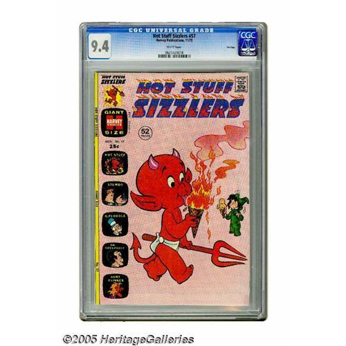<B>Hot Stuff Sizzlers #57 File Copy (Harvey, 1973) CGC NM 9.4 White pages.</B></I> Overstreet 2005 NM- 9.2 value = $16. CGC census 9/05: 1 in 9.4, none higher. <BR><BR><B>Important notice:</B> Heritage usually auctions material at the rate of 200-250 lots per hour. On some occasions eBay Live bid software or the Internet may not be able to keep up with the pace of the auction. We recommend placing a realistic absentee bid now as insurance to avoid disappointment. Occasionally the auctioneer may eliminate or reject an eBay Live bid, and the auctioneer may also reopen a lot after the close of the eBay live bidding (usually because we missed an audience bid), and may reject your bid even if it shows you as the winning bidder. By bidding via eBay Live, you agree that Heritage may award the lot to another bidder at its sole discretion under the circumstances described above or any other reasonable circumstances. Since eBay bids are not shown to us until we open the lot on the floor, we treat those bids just like floor bids. In most cases the floor responds before the eBay bid is presented to us, due to Internet lag time, so for consistency we have made it a policy that floor bids are always considered first over tie eBay live bids. Also please note that all Heritage lots purchased through eBay Live carry a 20% Buyer's Premium. Please make sure you read the Terms and Conditions before you bid. This lot is being auctioned in conjunction with a live floor auction by Heritage Galleries & Auctioneers. All final auction and invoice information will be supplied by Heritage Galleries & Auctioneers, and all other information should be considered preliminary. Lot:1458 <BR><BR><B>Winning Notification and Billing:</B> After the FINAL session in this auction is complete, Heritage will send e-mail and snail mail invoices. This process normally takes several days. All final auction and invoice information will be supplied by Heritage Galleries & Auctioneers, and all other information s