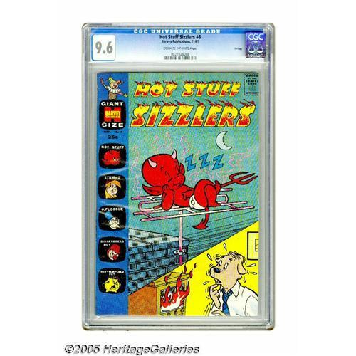 <B>Hot Stuff Sizzlers #6 File Copy (Harvey, 1961) CGC NM+ 9.6 Cream to off-white pages.</B></I> Overstreet 2005 NM- 9.2 value = $65. CGC census 8/05: 1 in 9.6, none higher. <BR><BR><B>Important notice:</B> Heritage usually auctions material at the rate of 200-250 lots per hour. On some occasions eBay Live bid software or the Internet may not be able to keep up with the pace of the auction. We recommend placing a realistic absentee bid now as insurance to avoid disappointment. Occasionally the auctioneer may eliminate or reject an eBay Live bid, and the auctioneer may also reopen a lot after the close of the eBay live bidding (usually because we missed an audience bid), and may reject your bid even if it shows you as the winning bidder. By bidding via eBay Live, you agree that Heritage may award the lot to another bidder at its sole discretion under the circumstances described above or any other reasonable circumstances. Since eBay bids are not shown to us until we open the lot on the floor, we treat those bids just like floor bids. In most cases the floor responds before the eBay bid is presented to us, due to Internet lag time, so for consistency we have made it a policy that floor bids are always considered first over tie eBay live bids. Also please note that all Heritage lots purchased through eBay Live carry a 20% Buyer's Premium. Please make sure you read the Terms and Conditions before you bid. This lot is being auctioned in conjunction with a live floor auction by Heritage Galleries & Auctioneers. All final auction and invoice information will be supplied by Heritage Galleries & Auctioneers, and all other information should be considered preliminary. Lot:1417 <BR><BR><B>Winning Notification and Billing:</B> After the FINAL session in this auction is complete, Heritage will send e-mail and snail mail invoices. This process normally takes several days. All final auction and invoice information will be supplied by Heritage Galleries & Auctioneers, and all other