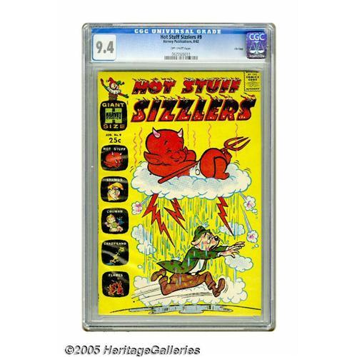 <B>Hot Stuff Sizzlers #9 File Copy (Harvey, 1962) CGC NM 9.4 Off-white pages.</B></I> Overstreet 2005 NM- 9.2 value = $65. CGC census 8/05: 1 in 9.4, none higher. <BR><BR><B>Important notice:</B> Heritage usually auctions material at the rate of 200-250 lots per hour. On some occasions eBay Live bid software or the Internet may not be able to keep up with the pace of the auction. We recommend placing a realistic absentee bid now as insurance to avoid disappointment. Occasionally the auctioneer may eliminate or reject an eBay Live bid, and the auctioneer may also reopen a lot after the close of the eBay live bidding (usually because we missed an audience bid), and may reject your bid even if it shows you as the winning bidder. By bidding via eBay Live, you agree that Heritage may award the lot to another bidder at its sole discretion under the circumstances described above or any other reasonable circumstances. Since eBay bids are not shown to us until we open the lot on the floor, we treat those bids just like floor bids. In most cases the floor responds before the eBay bid is presented to us, due to Internet lag time, so for consistency we have made it a policy that floor bids are always considered first over tie eBay live bids. Also please note that all Heritage lots purchased through eBay Live carry a 20% Buyer's Premium. Please make sure you read the Terms and Conditions before you bid. This lot is being auctioned in conjunction with a live floor auction by Heritage Galleries & Auctioneers. All final auction and invoice information will be supplied by Heritage Galleries & Auctioneers, and all other information should be considered preliminary. Lot:1418 <BR><BR><B>Winning Notification and Billing:</B> After the FINAL session in this auction is complete, Heritage will send e-mail and snail mail invoices. This process normally takes several days. All final auction and invoice information will be supplied by Heritage Galleries & Auctioneers, and all other informatio