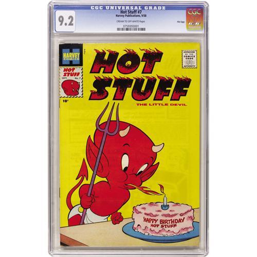 <B>Hot Stuff, the Little Devil #7 File Copy (Harvey, 1958) CGC NM- 9.2 Cream to off-white pages.</B></I> With a fiery puff, Hot Stuff lights the candle on his birthday cake in this colorful, glossy cover. Overstreet 2006 NM- 9.2 value = $140. CGC census 3/07: 2 in 9.2, none higher. <I> From the Cary and Cheryl Porter Collection.</B></I><BR><BR><b>Shipping:</b> Comics - Slabbed (certified) (<a target="_blank" href="http://www.heritageauctions.com/common/shipping.php">view shipping information</a>)