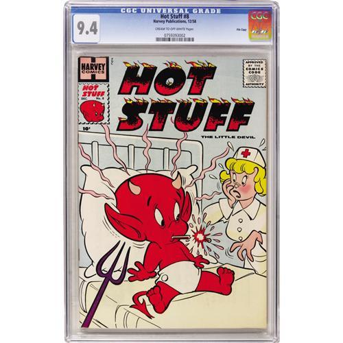 <B>Hot Stuff, the Little Devil #8 File Copy (Harvey, 1958) CGC NM 9.4 Cream to off-white pages.</B></I> This title is super hot right now. Get your oven mitts on and pick up this file copy! Overstreet 2006 NM- 9.2 value = $140. CGC census 3/07: 2 in 9.4, 1 higher. <I> From the Cary and Cheryl Porter Collection.</B></I><BR><BR><b>Shipping:</b> Comics - Slabbed (certified) (<a target="_blank" href="http://www.heritageauctions.com/common/shipping.php">view shipping information</a>)