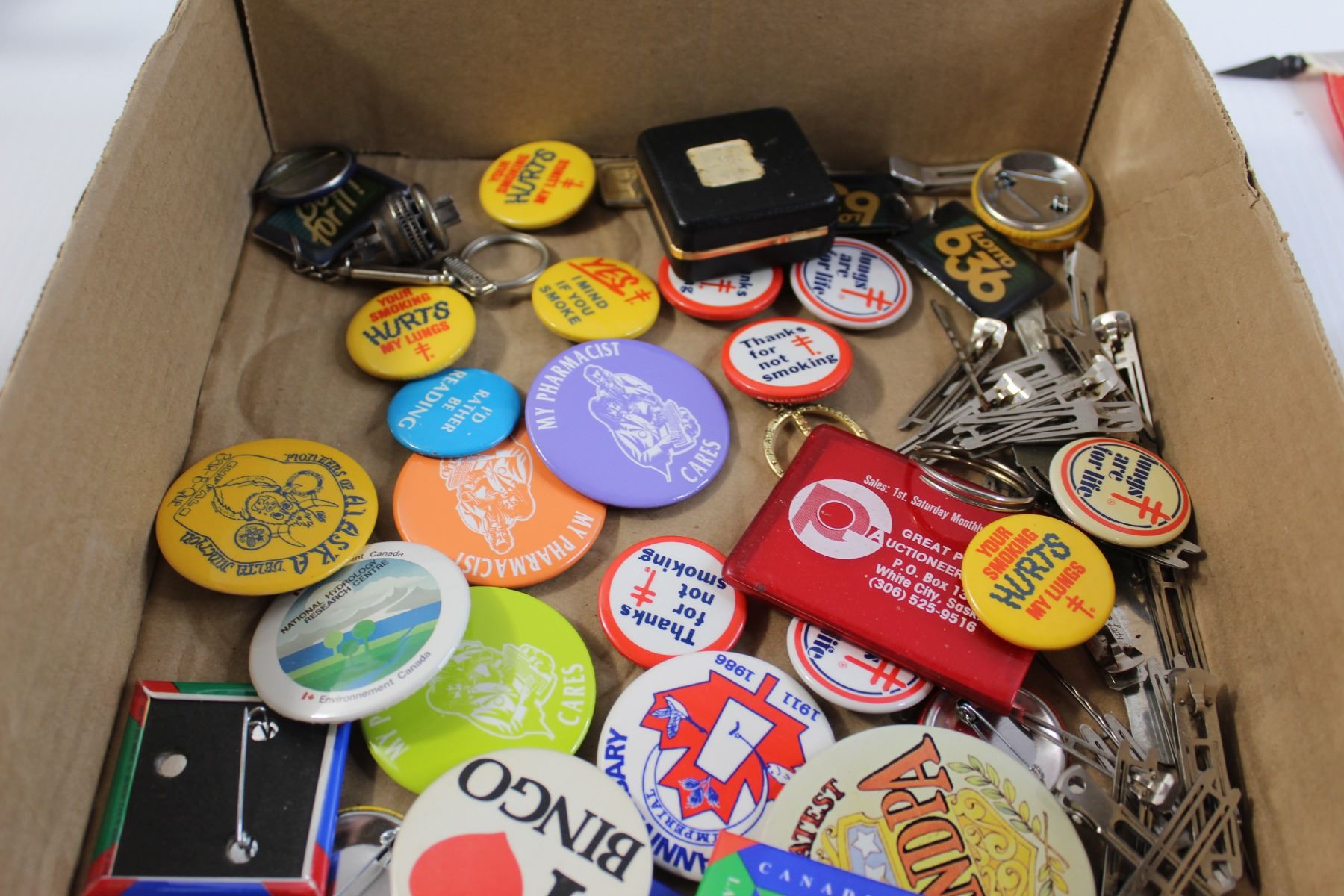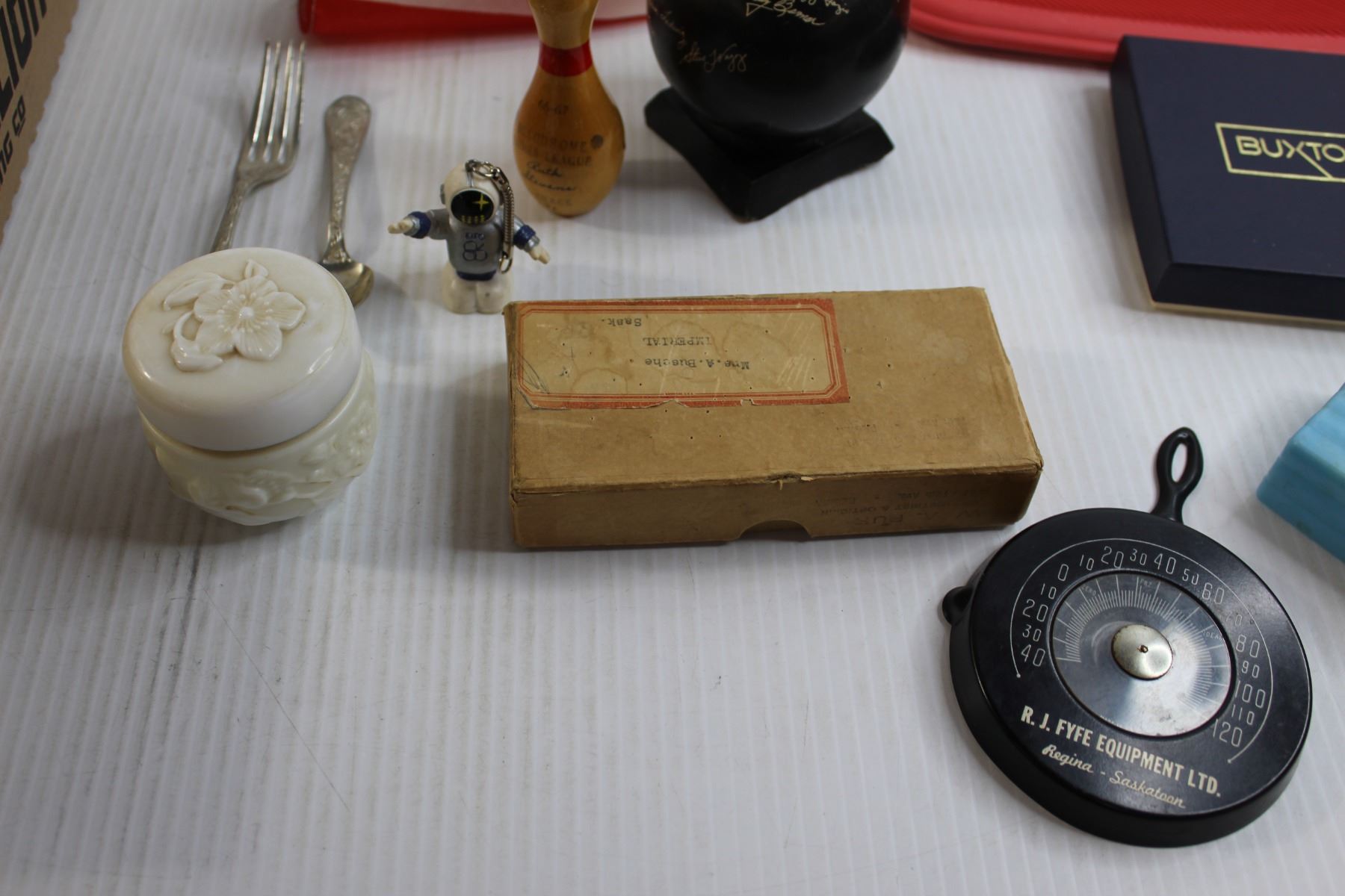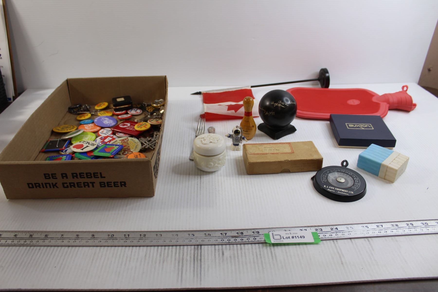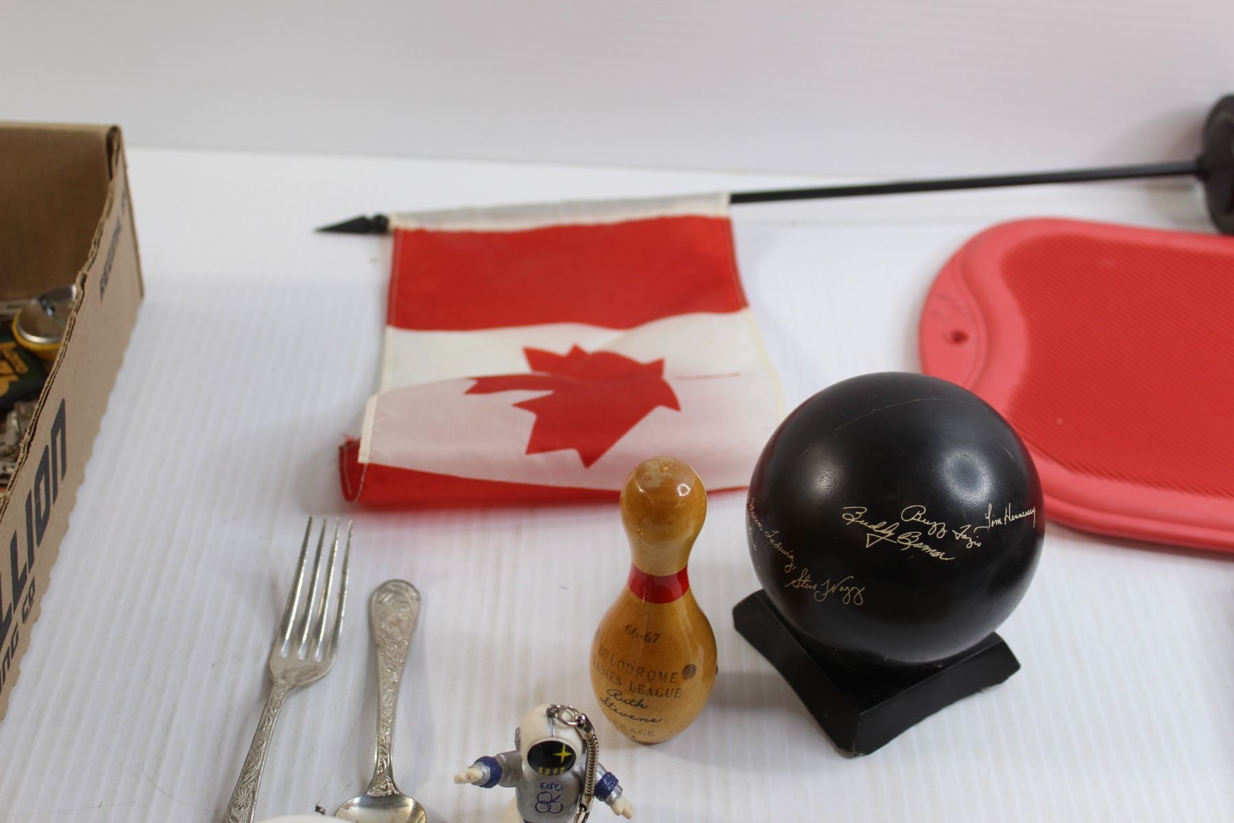Hot Water Bottle, Canadian Flag, Bowling Decorations, Assorted Pins, Misc.